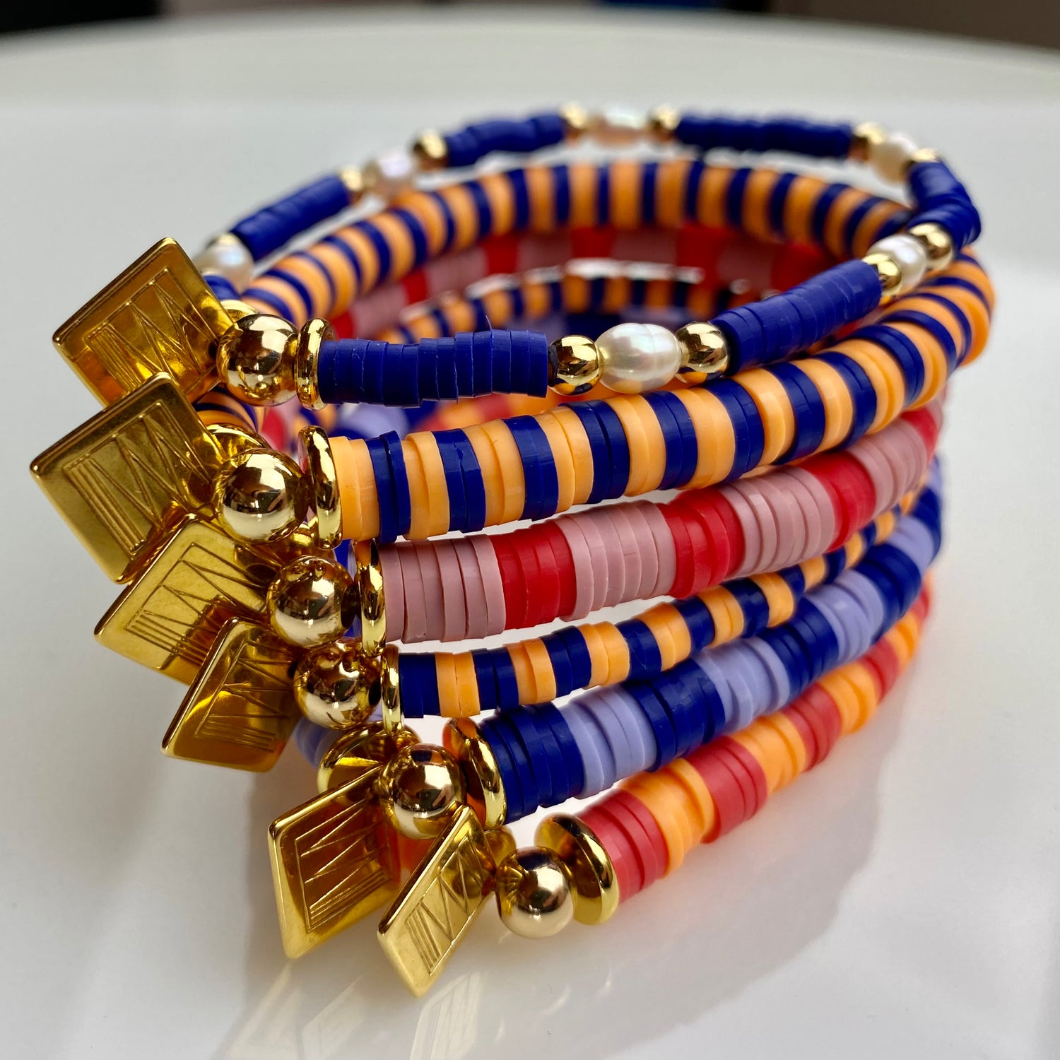 Die ODE TO JOY Kollektion bringt mit ihrem reichen Farbenspektrum einen strahlenden Akzent zu jedem Outfit. Die Katsukiperlen sind auf einem transparenten, elastischen Gummiband aufgezogen und werden mit hochwertigen 24K-vergoldeten Messingelementen ergänzt.