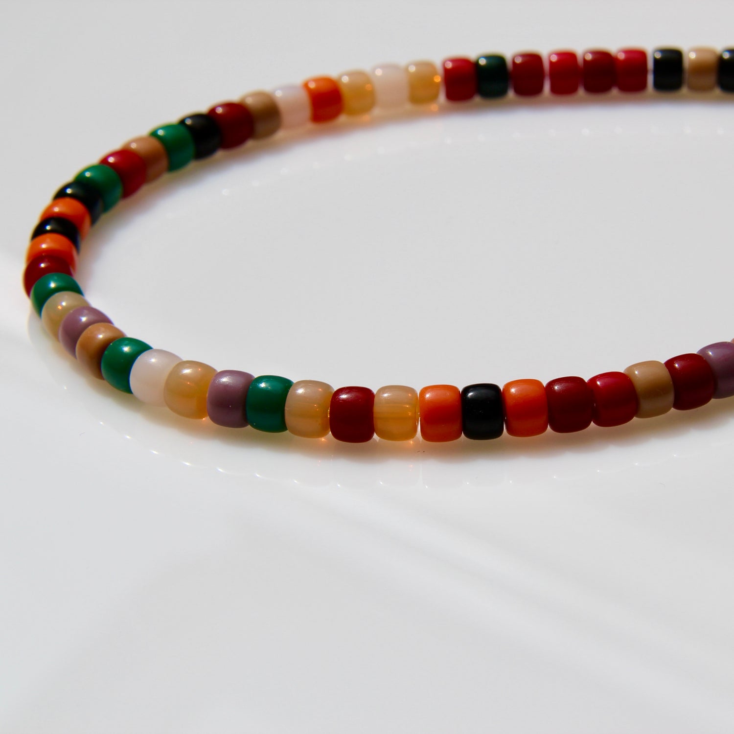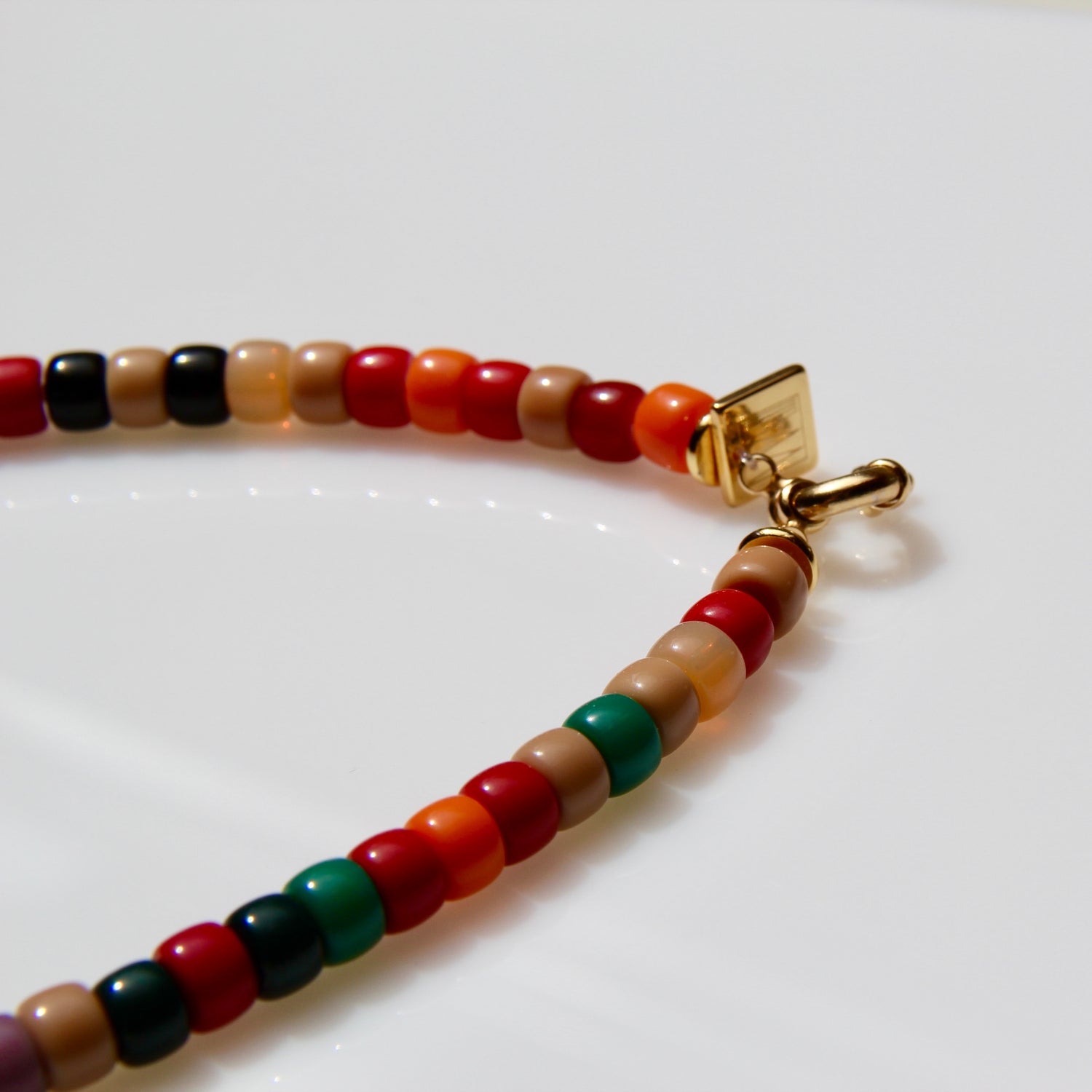 Glass beads in many intense colors on a transparent string combined with a 14k-gold-plated brass spring ring clasp