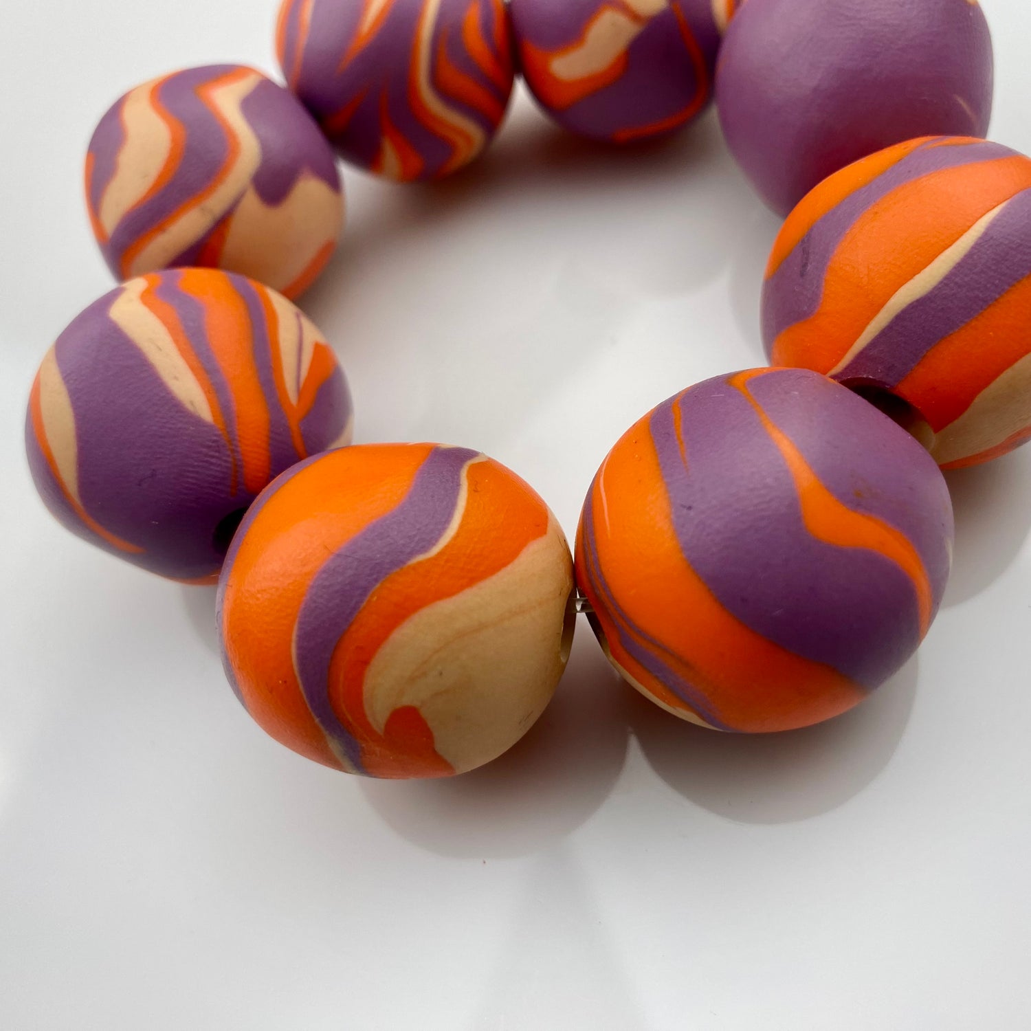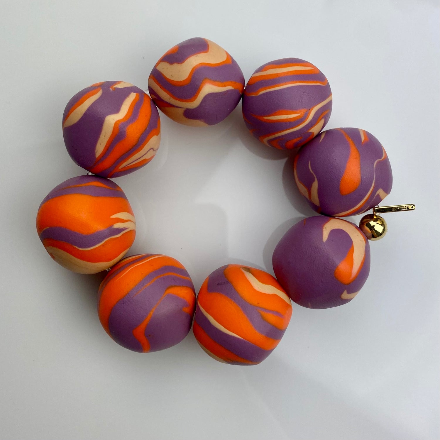 Made of lightweight clay with a glossy finish, lined up on a transparent and flexible string and gold-plated brass.