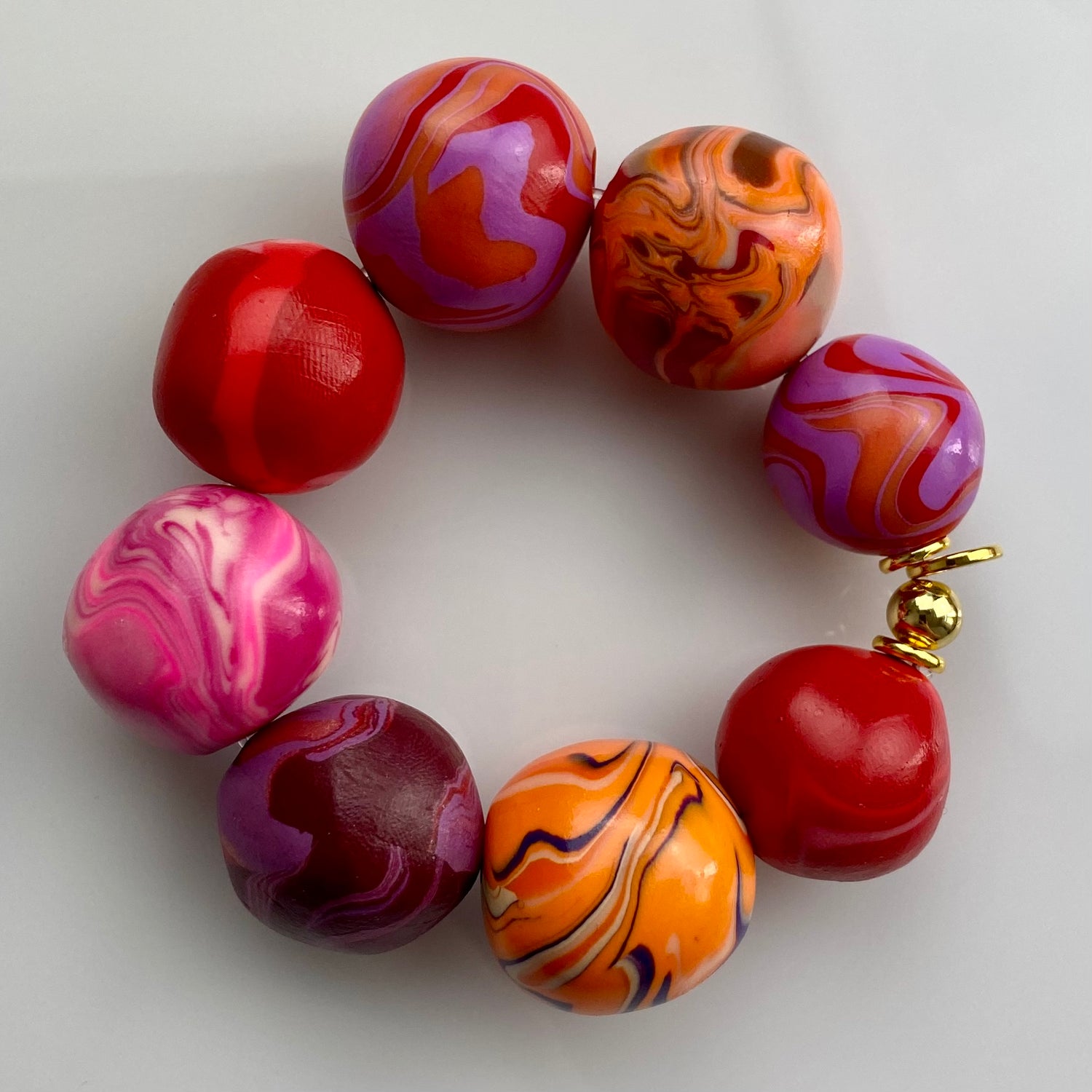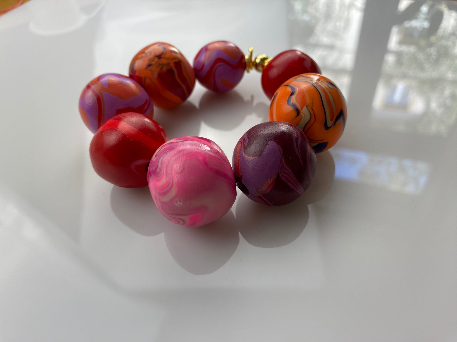 Made of lightweight clay with a glossy finish, lined up on a transparent and flexible string and gold-plated brass.