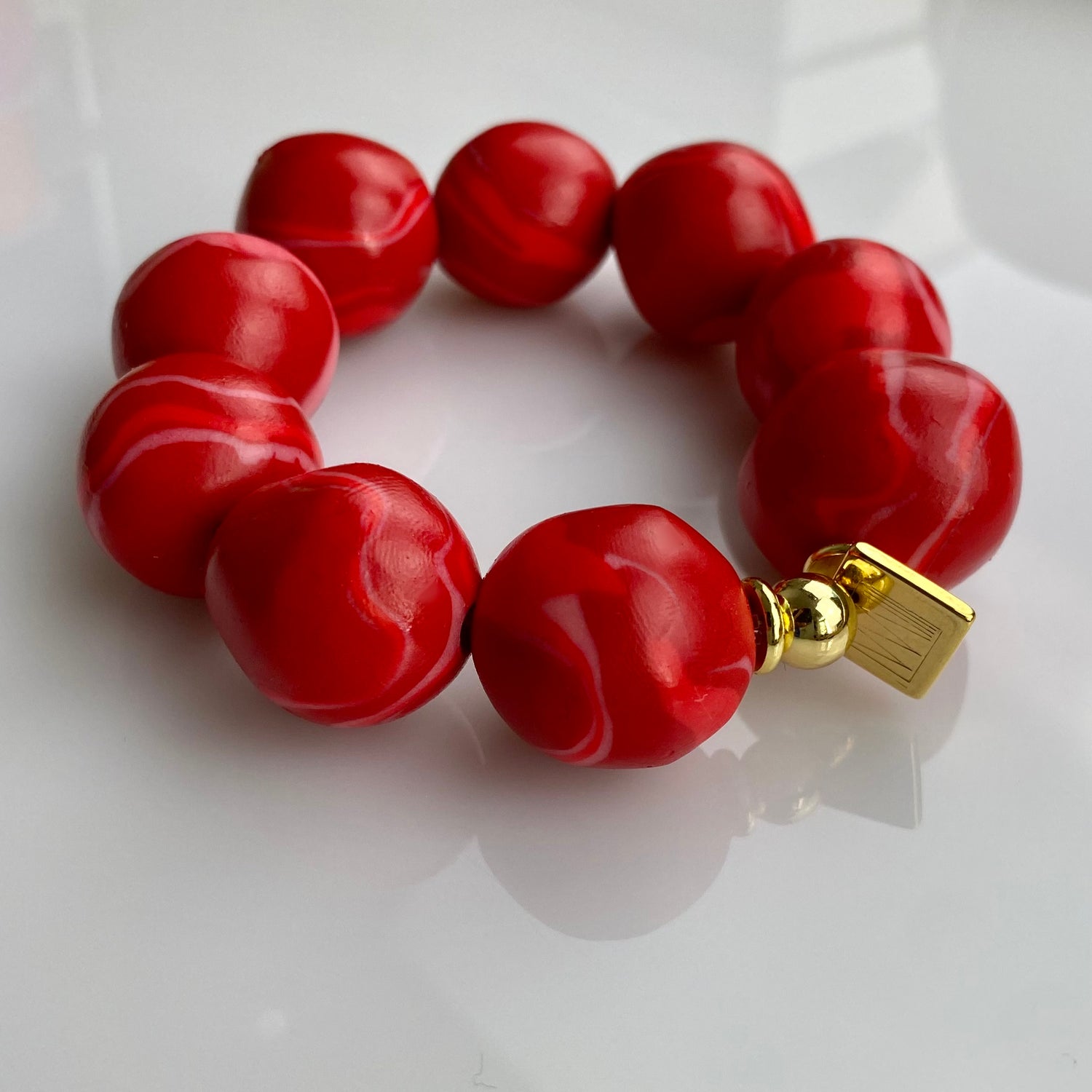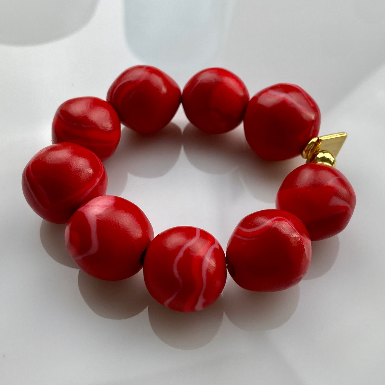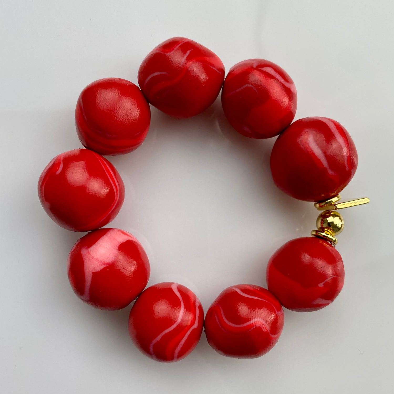Made of lightweight clay with a glossy finish, lined up on a transparent and flexible string and gold-plated brass.