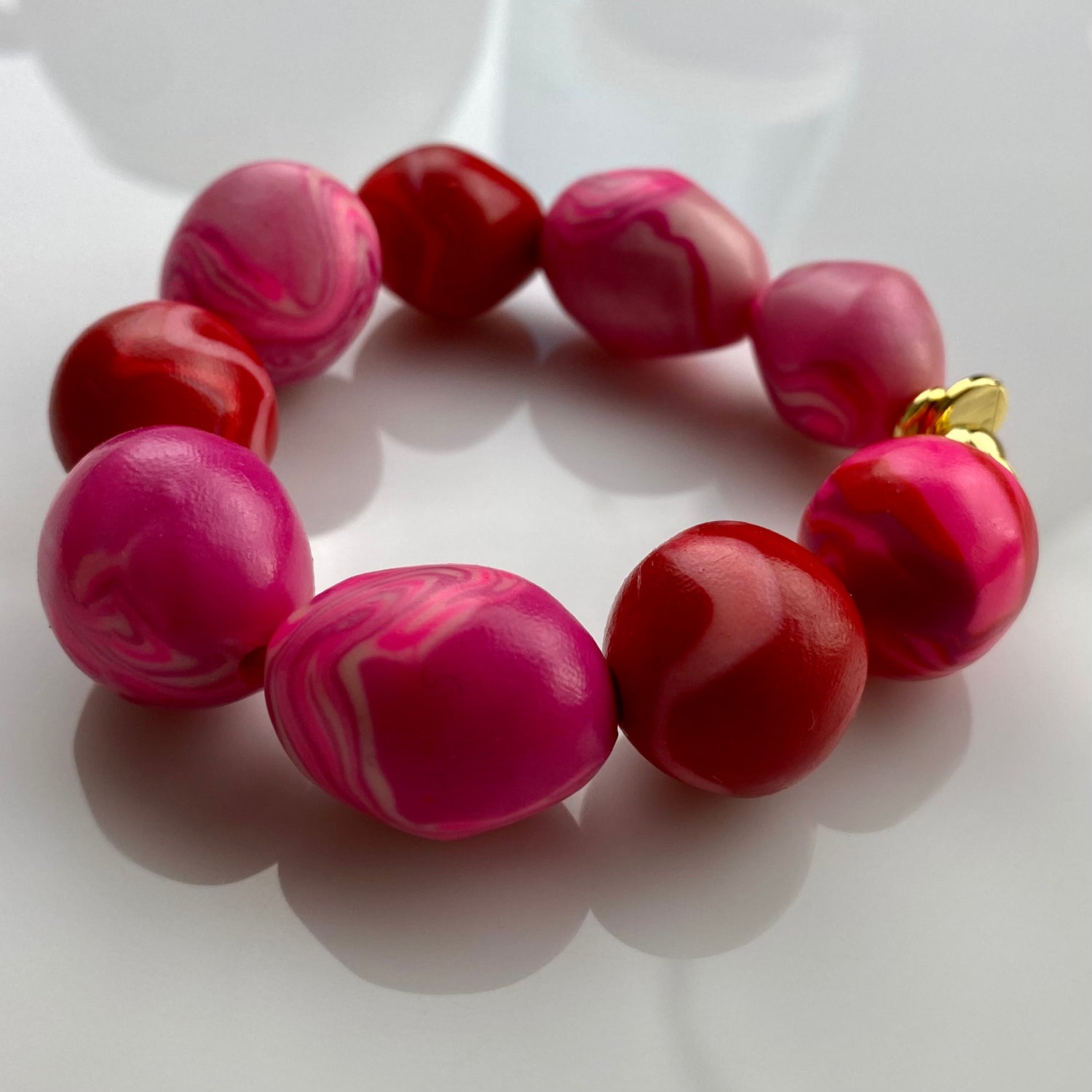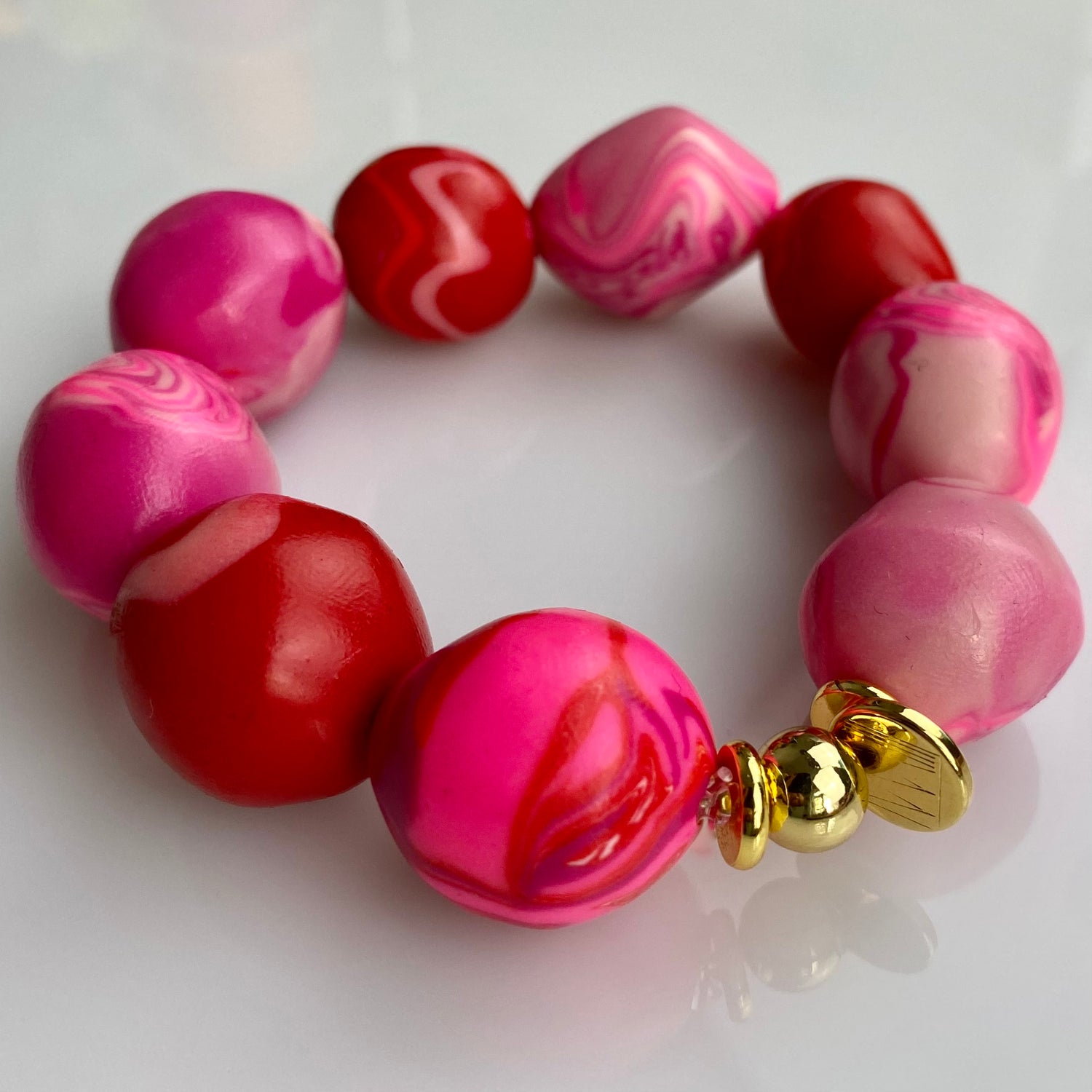 Made of lightweight clay with a glossy finish, lined up on a transparent and flexible string and gold-plated brass.