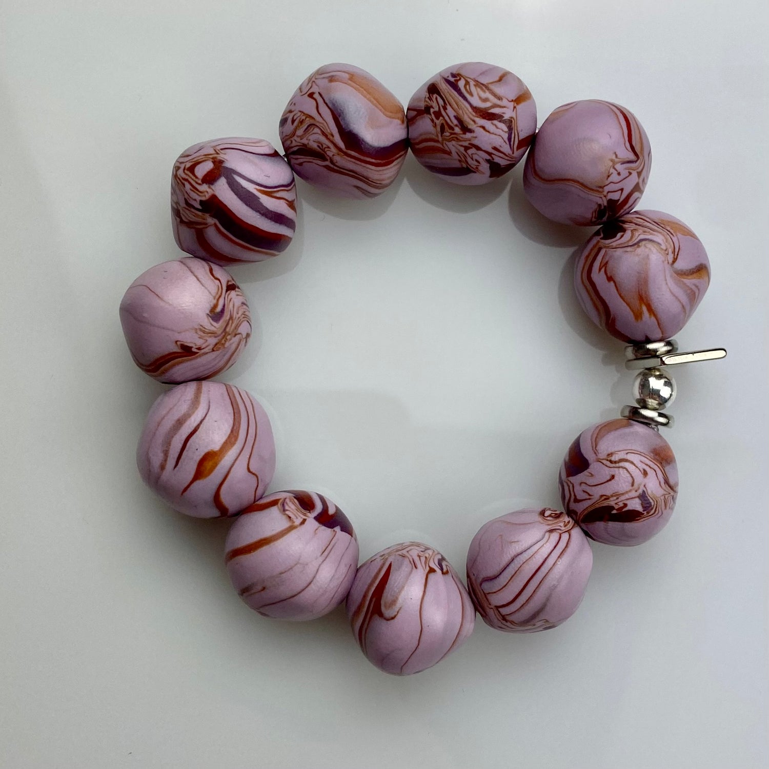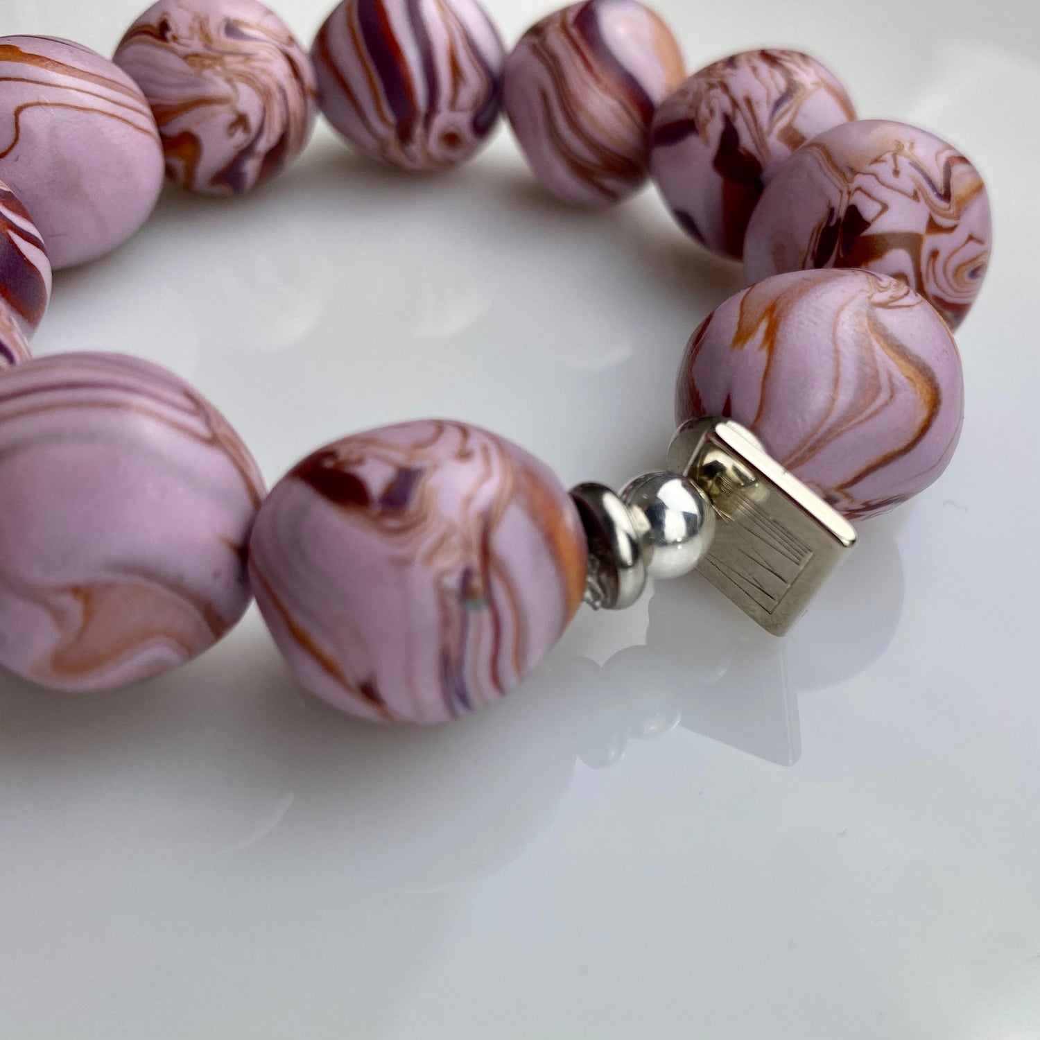 Made of lightweight clay with a glossy finish, lined up on a transparent and flexible string and rhodium-plated brass.