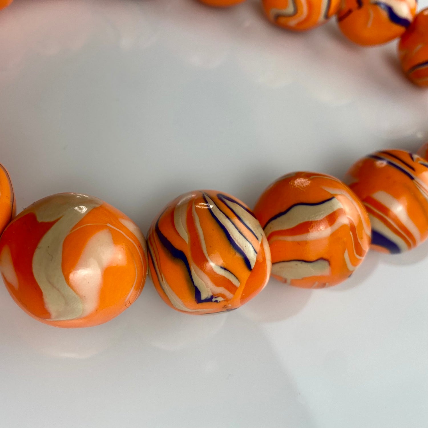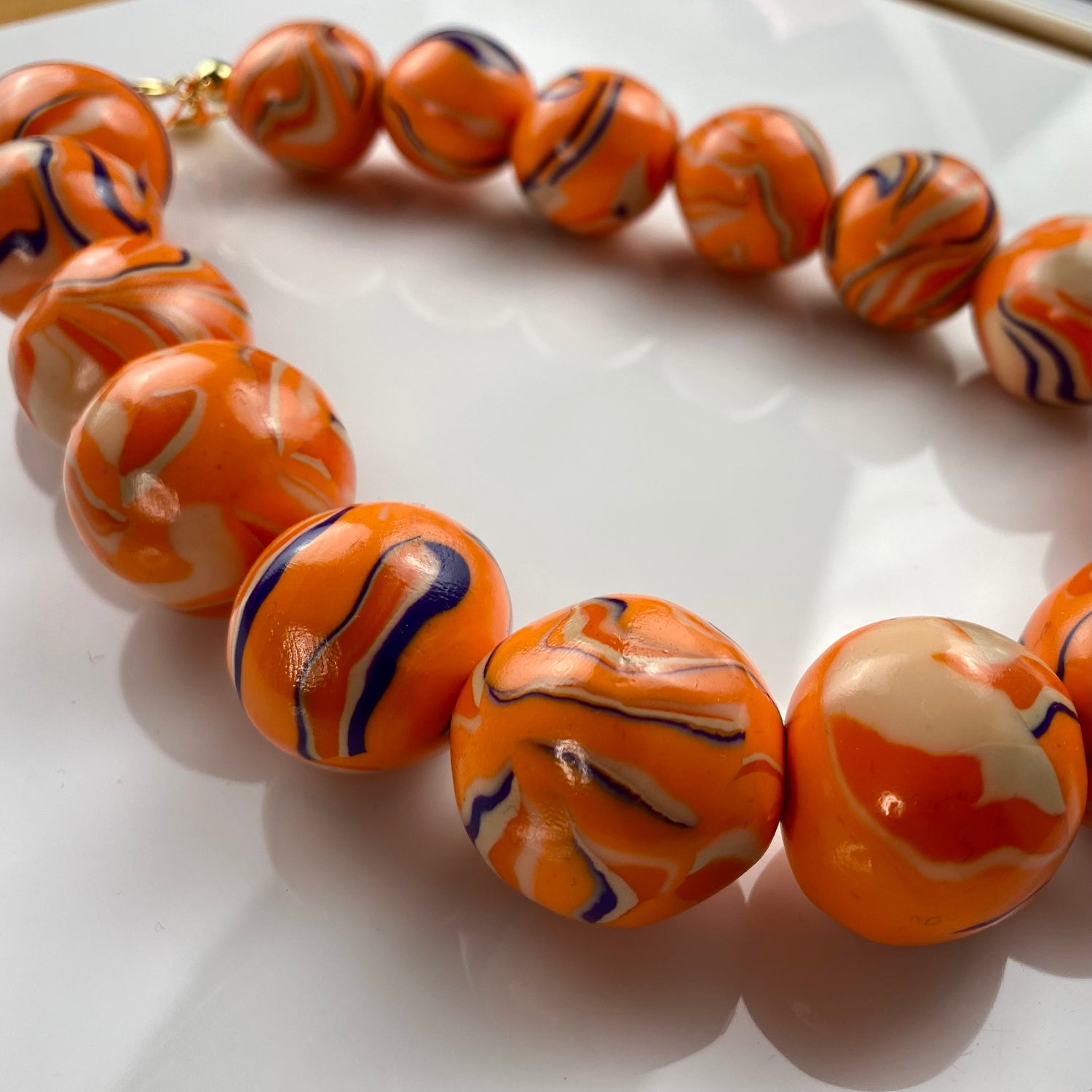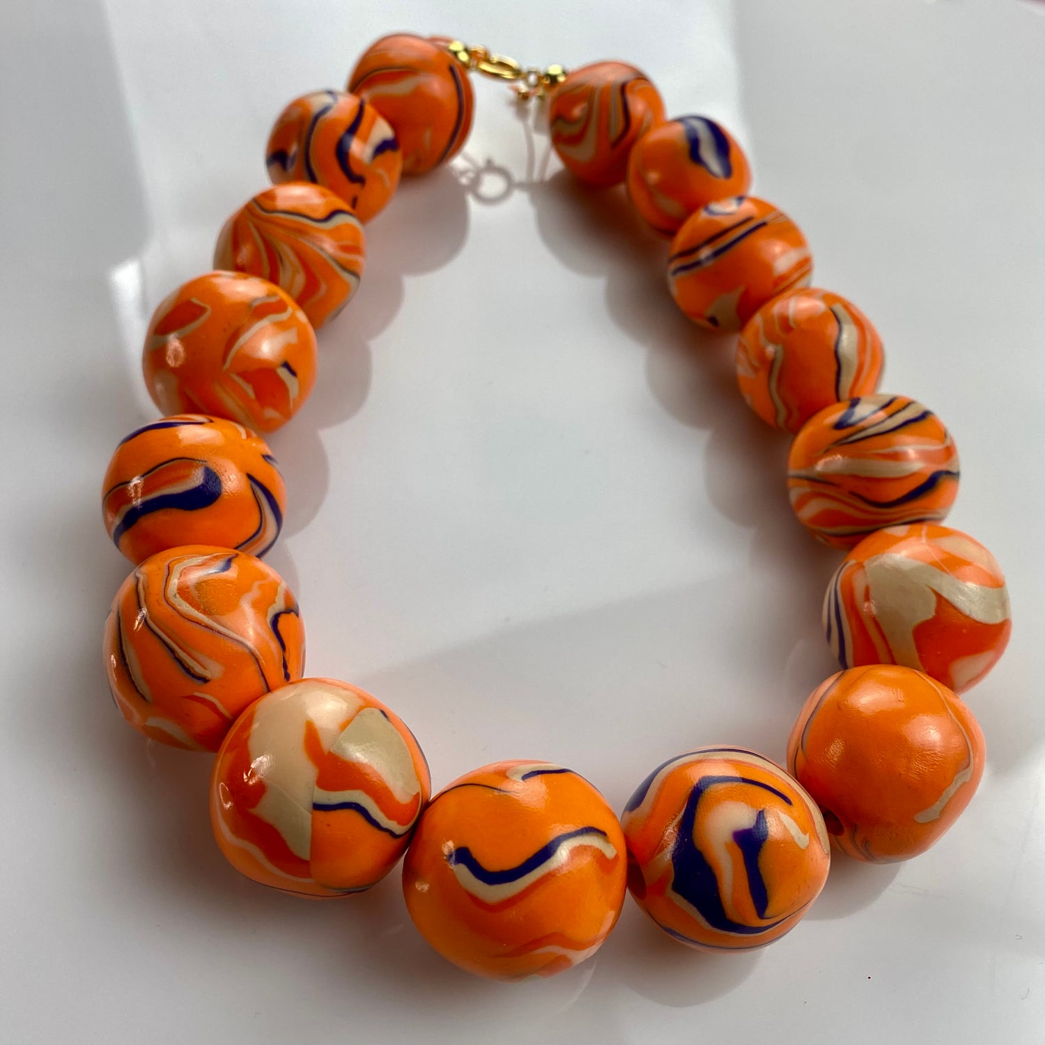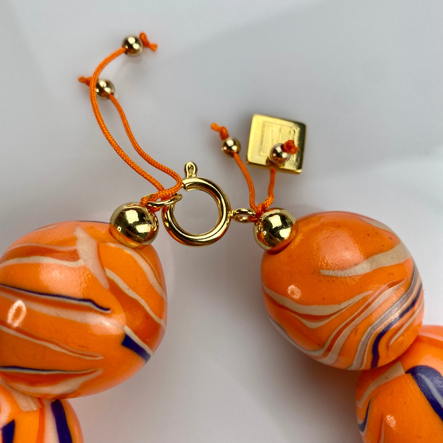 Made of lightweight clay with a glossy finish, lined up on a colored and woven string and gold-plated brass.