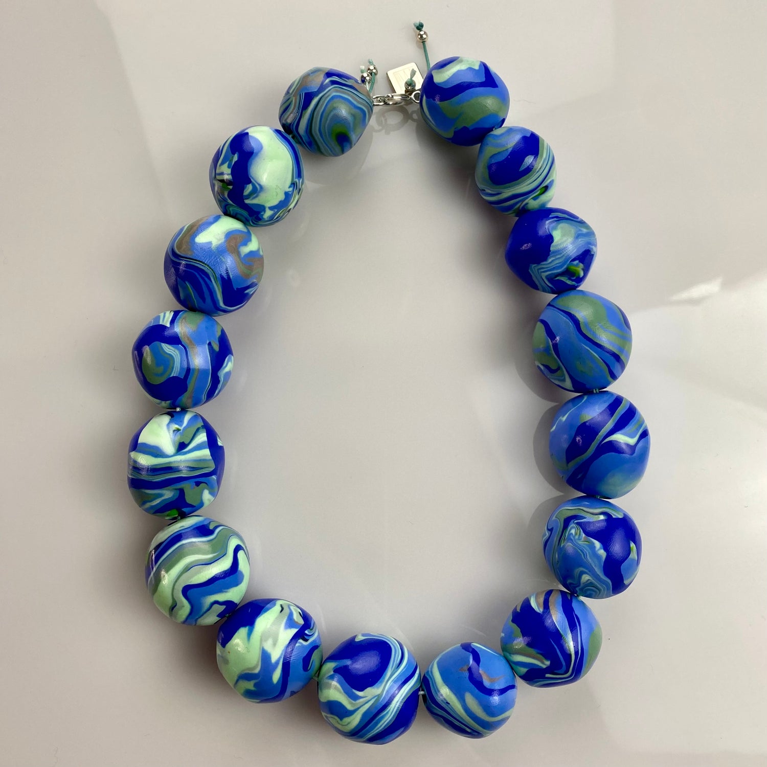 Made of lightweight clay with a glossy finish, lined up on a colored and woven string and rhodium-plated brass.