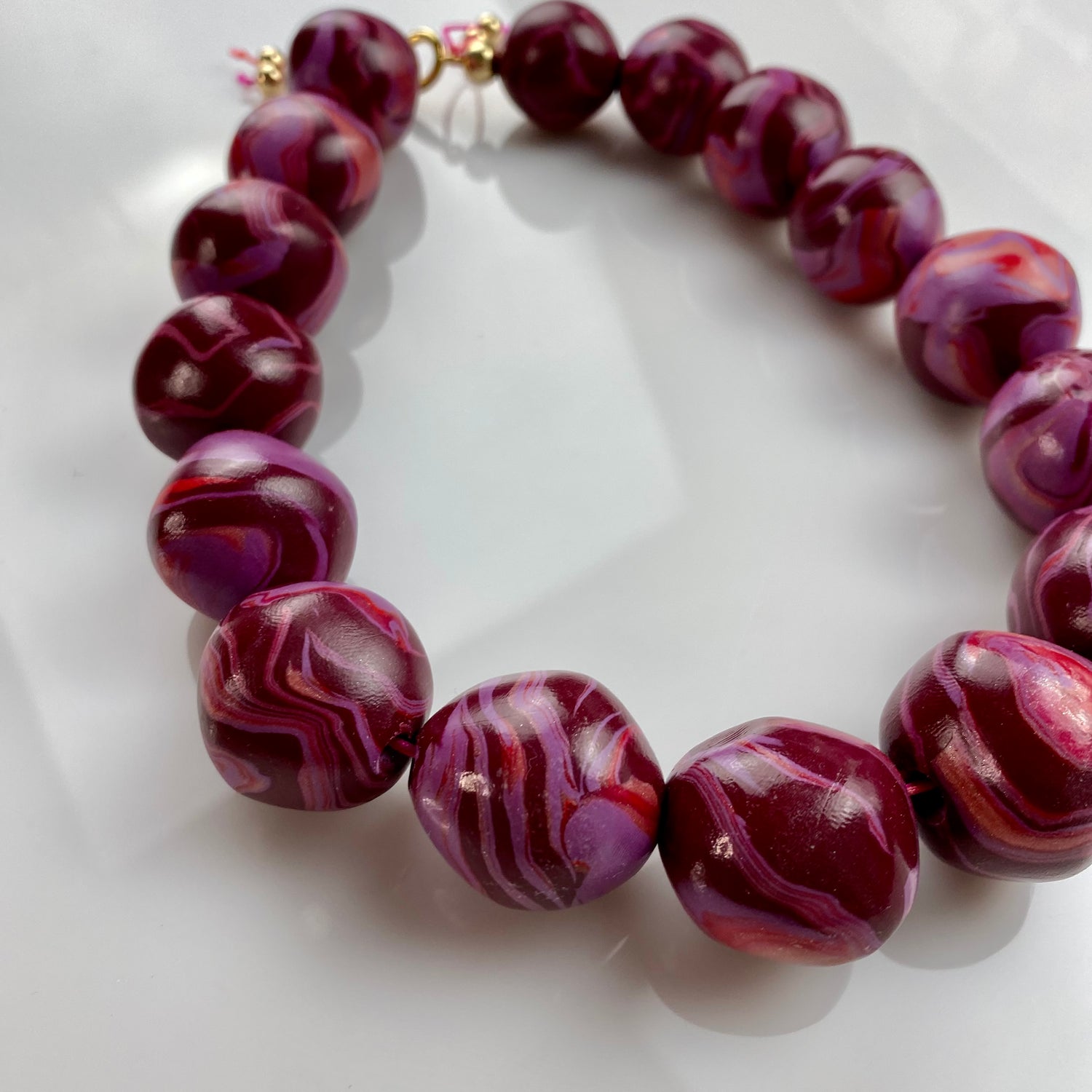 Made of lightweight clay with a glossy finish, lined up on a colored and woven string and gold-plated brass.