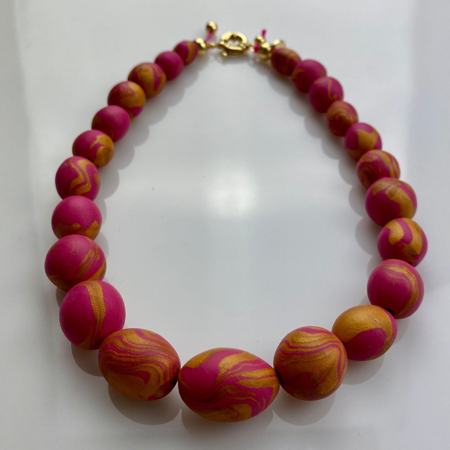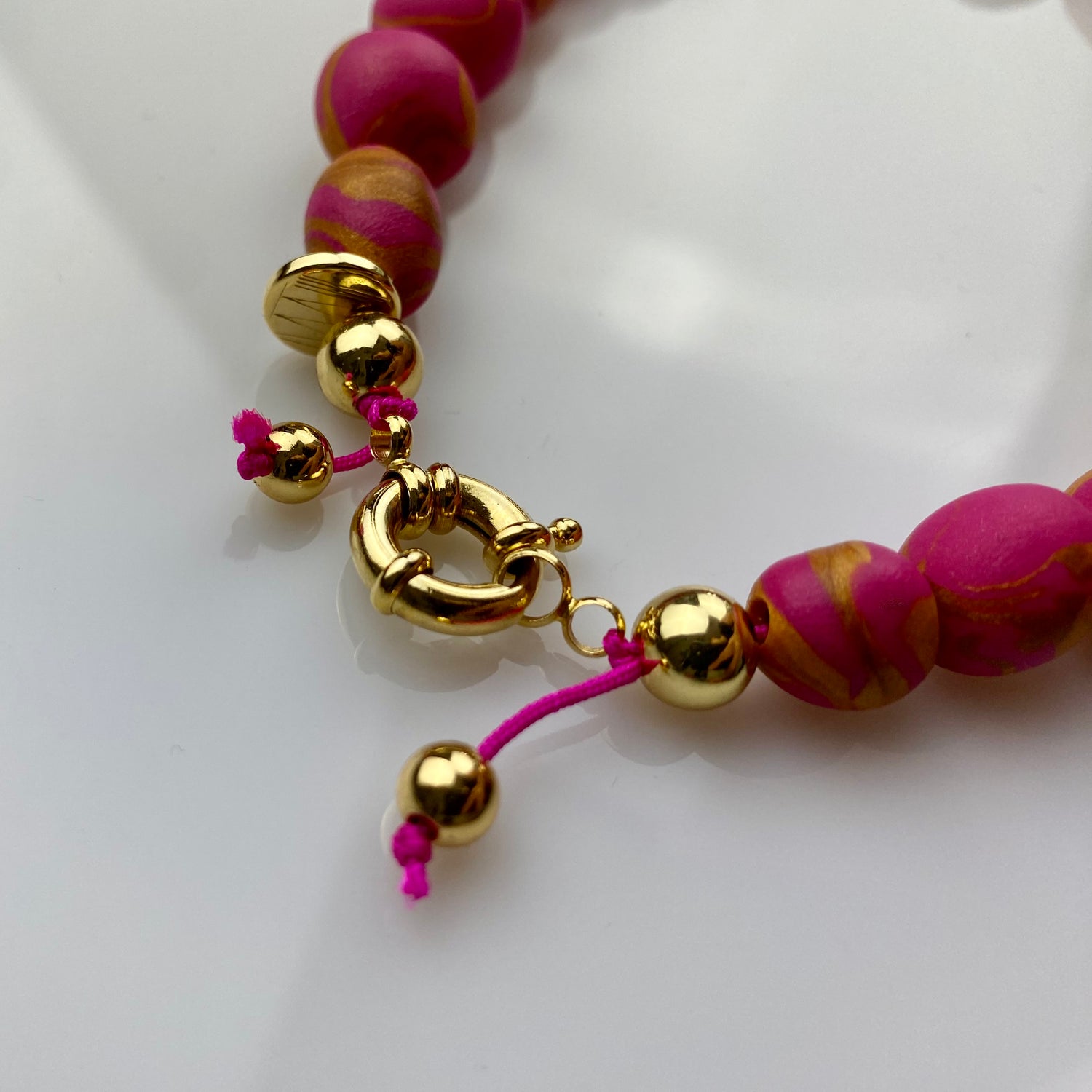 Made of lightweight clay with a glossy finish, lined up on a colored and woven string and gold-plated brass.