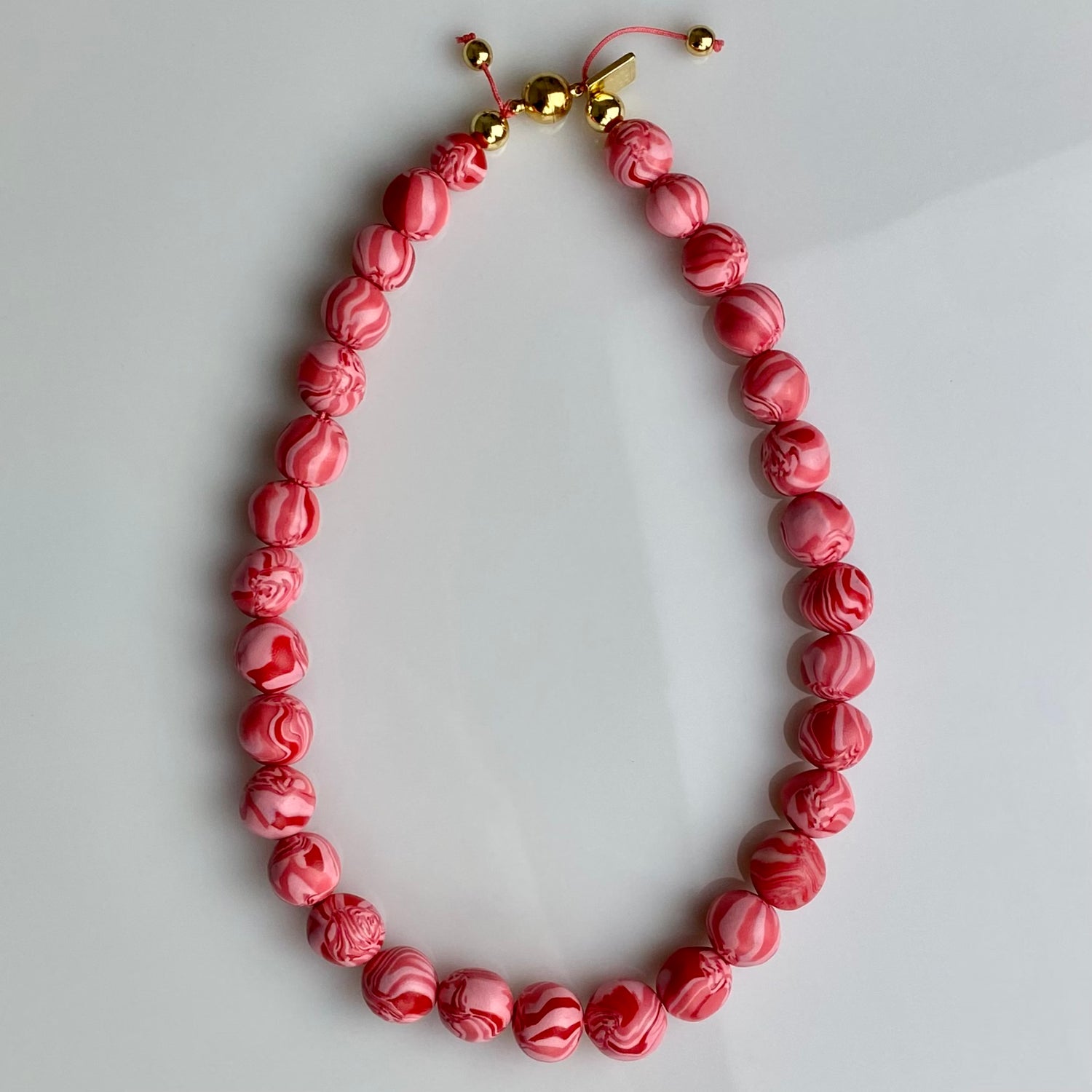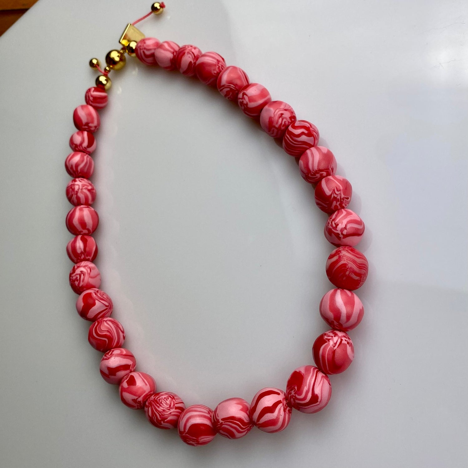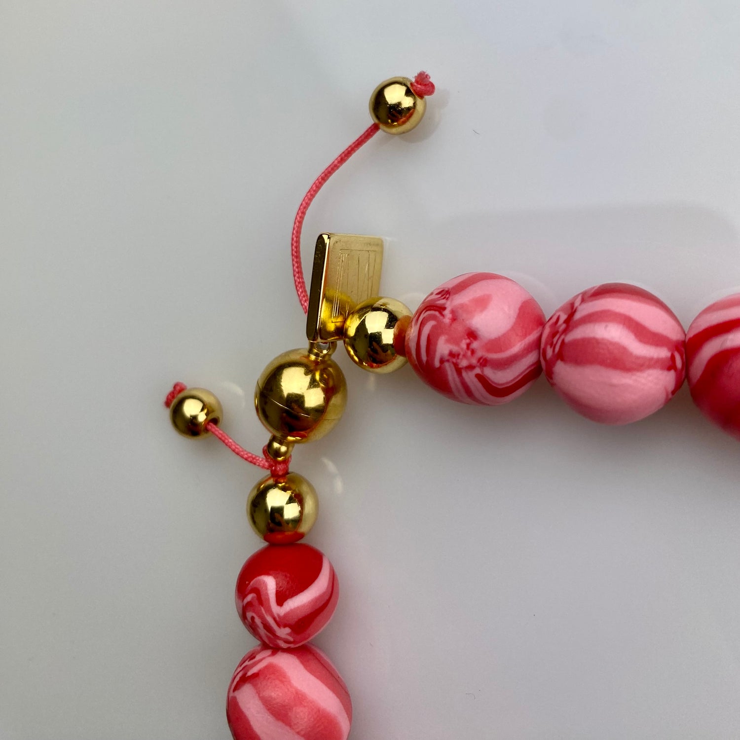 Made of lightweight clay with a glossy finish, lined up on a colored and woven string and gold-plated brass.