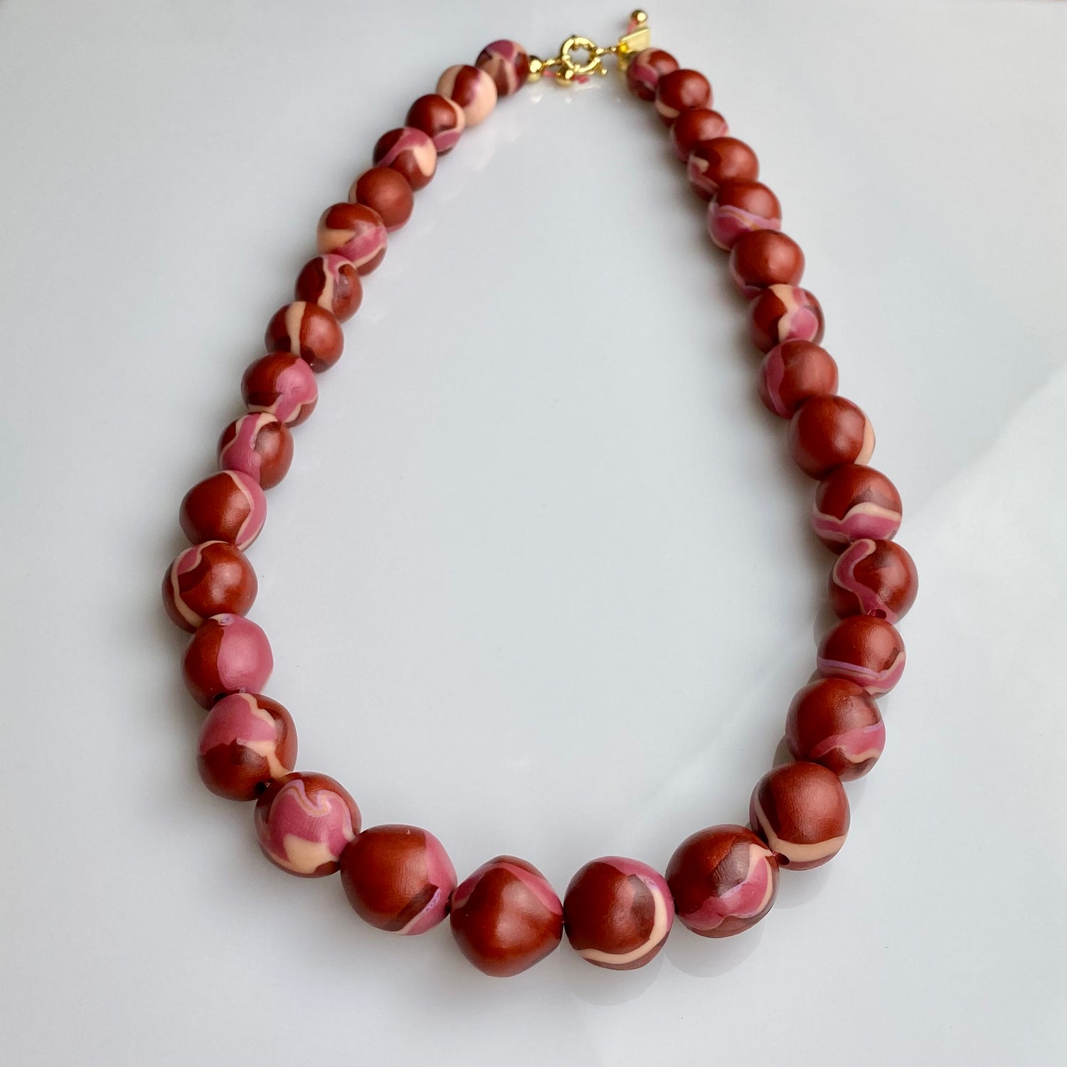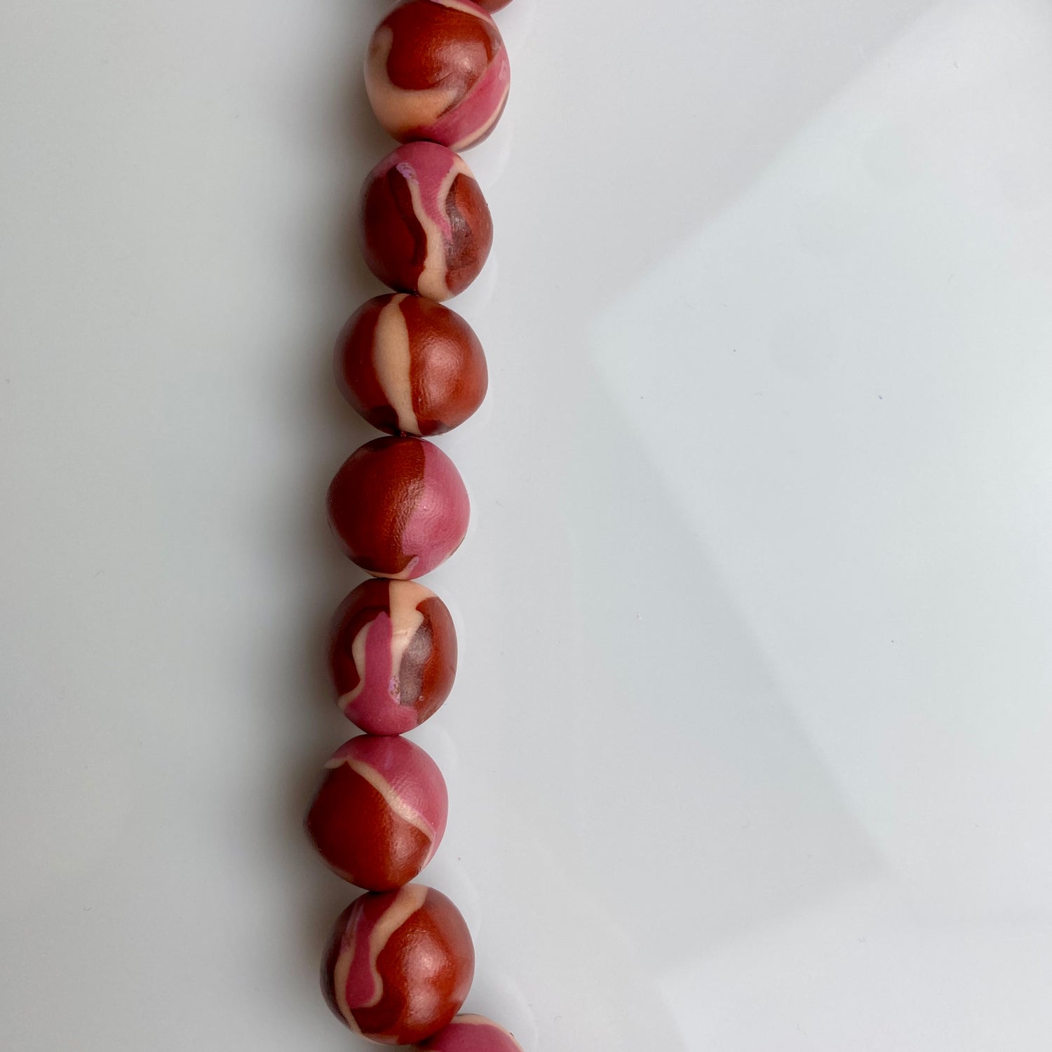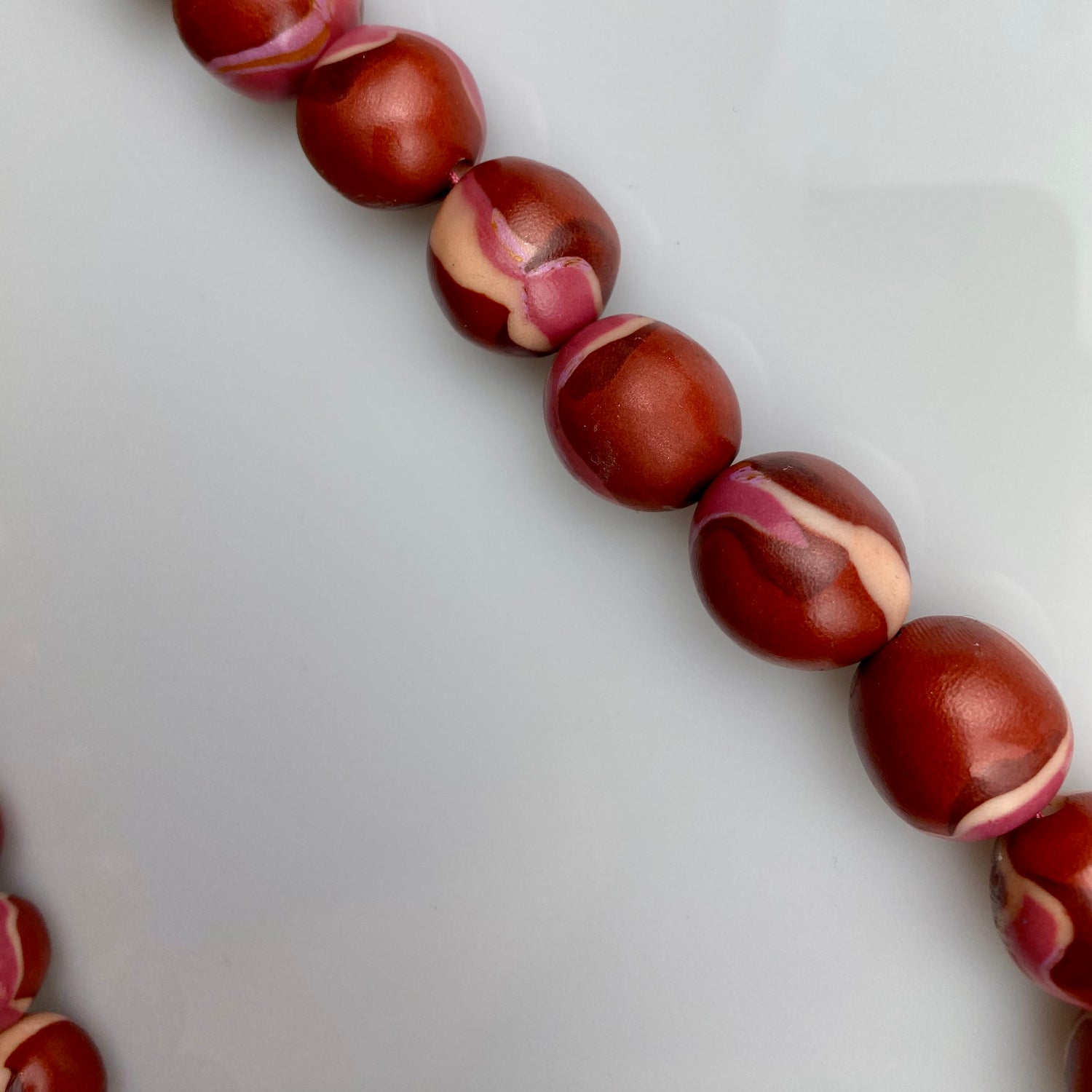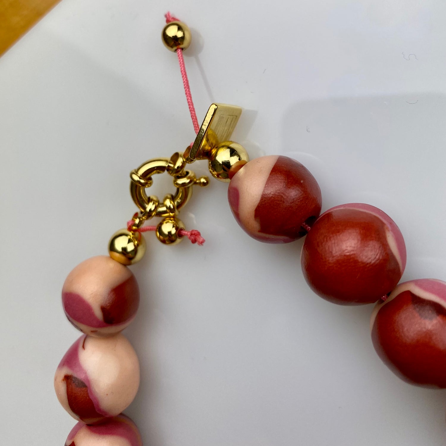 Made of lightweight clay with a glossy finish, lined up on a colored and woven string and gold-plated brass.