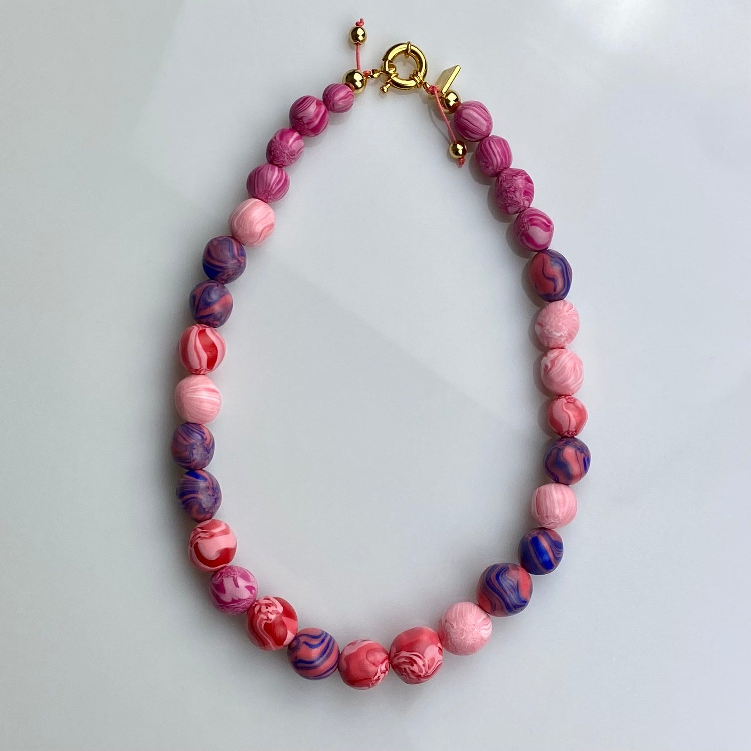 Made of lightweight clay with a glossy finish, lined up on a colored and woven string and gold-plated brass.