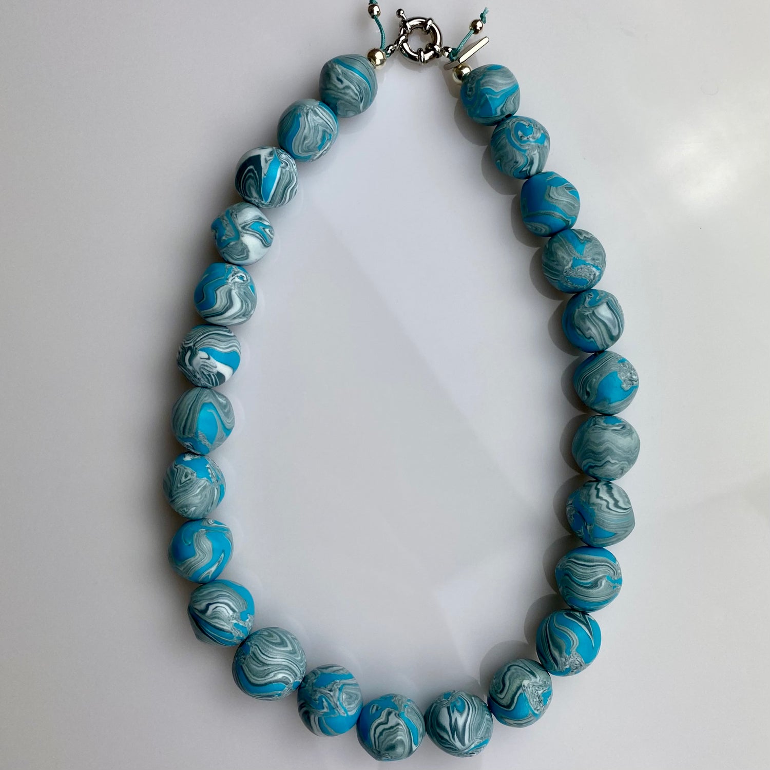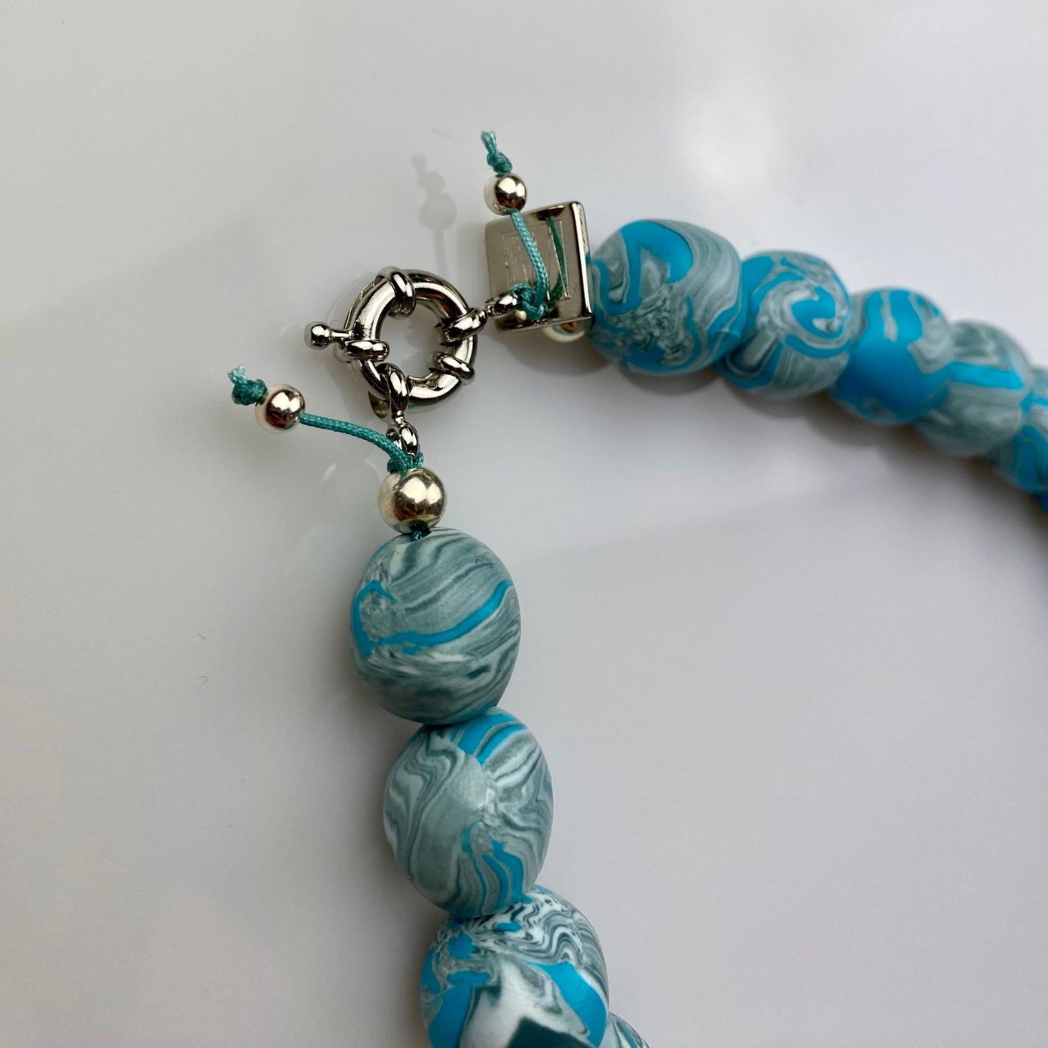 Made of lightweight clay with a glossy finish, lined up on a colored and woven string and rhodium-plated brass.