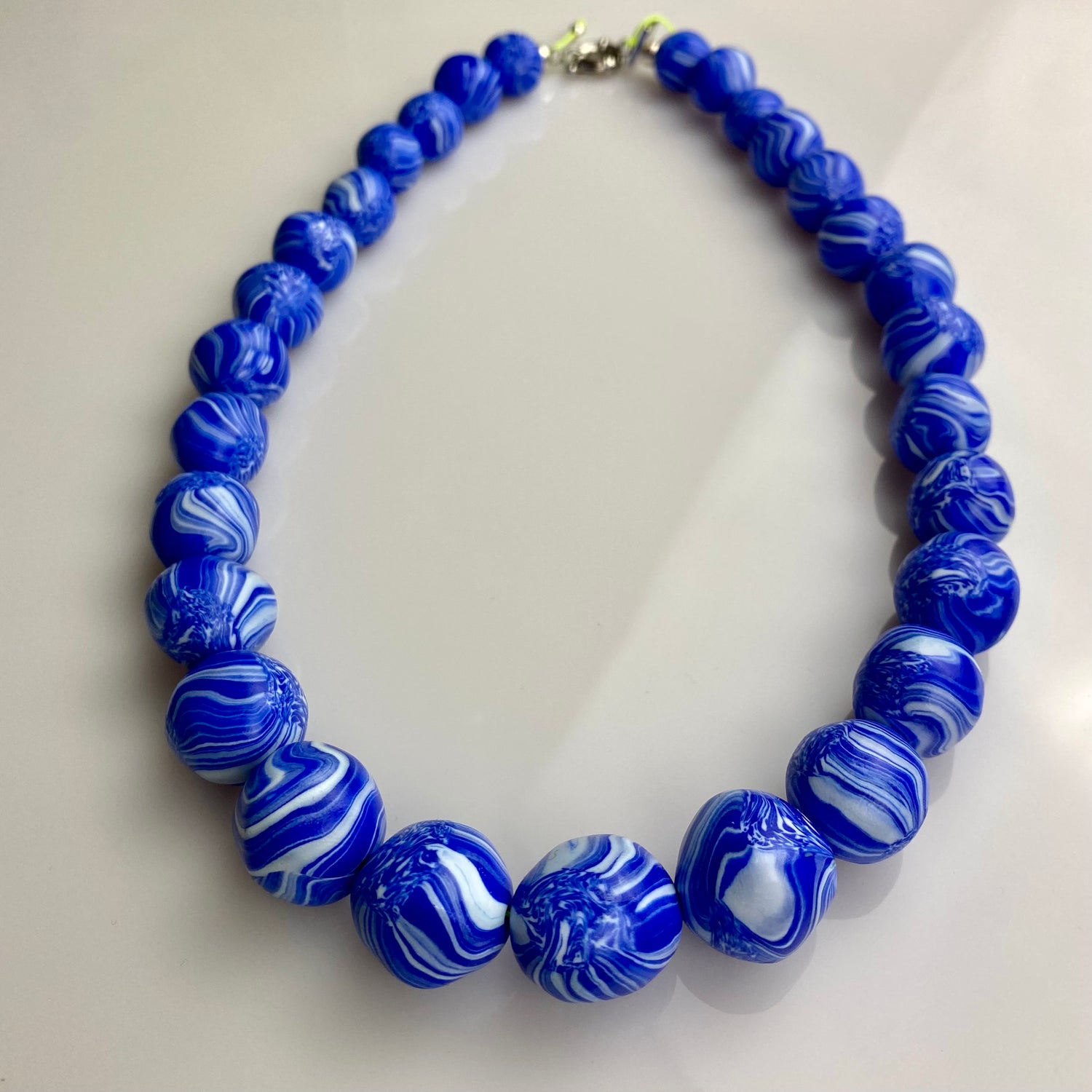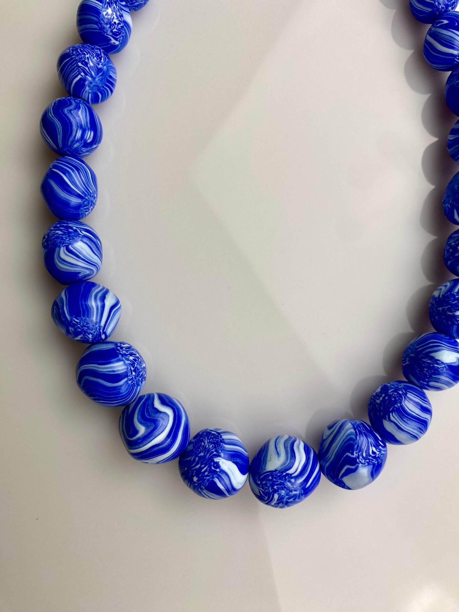 Made of lightweight clay with a glossy finish, lined up on a colored and woven string and rhodium-plated brass.