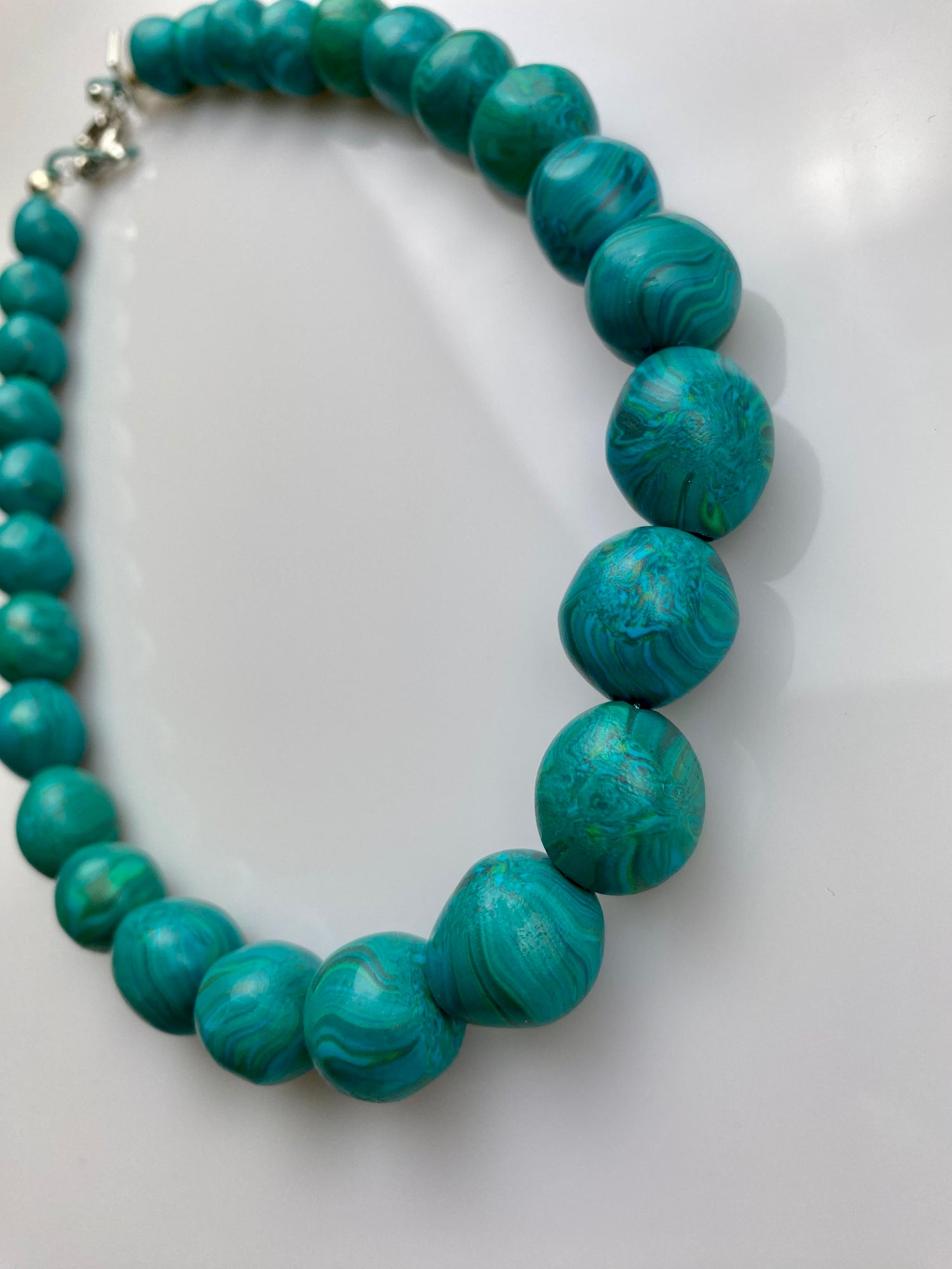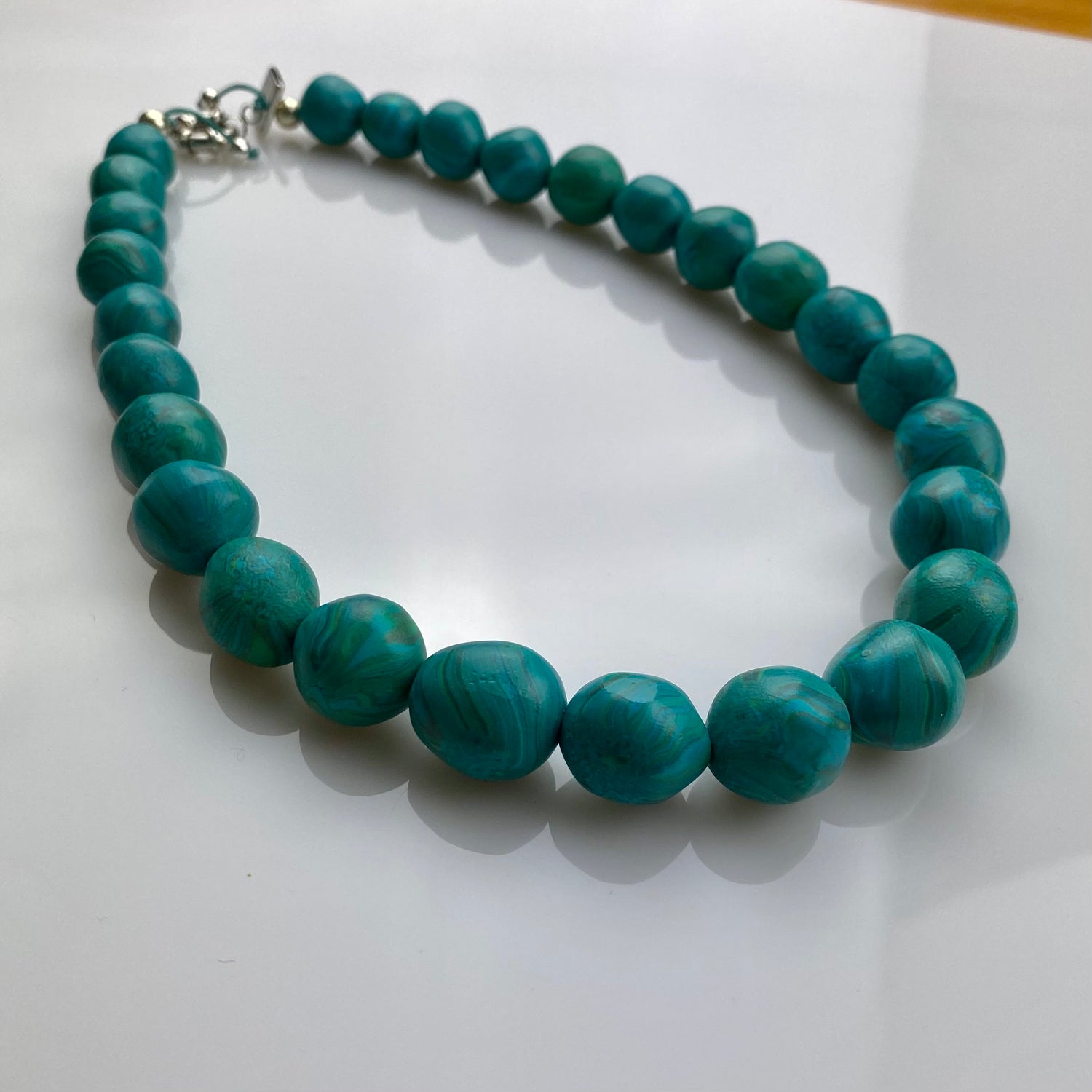Made of lightweight clay with a glossy finish, lined up on a colored and woven string and rhodium-plated brass.