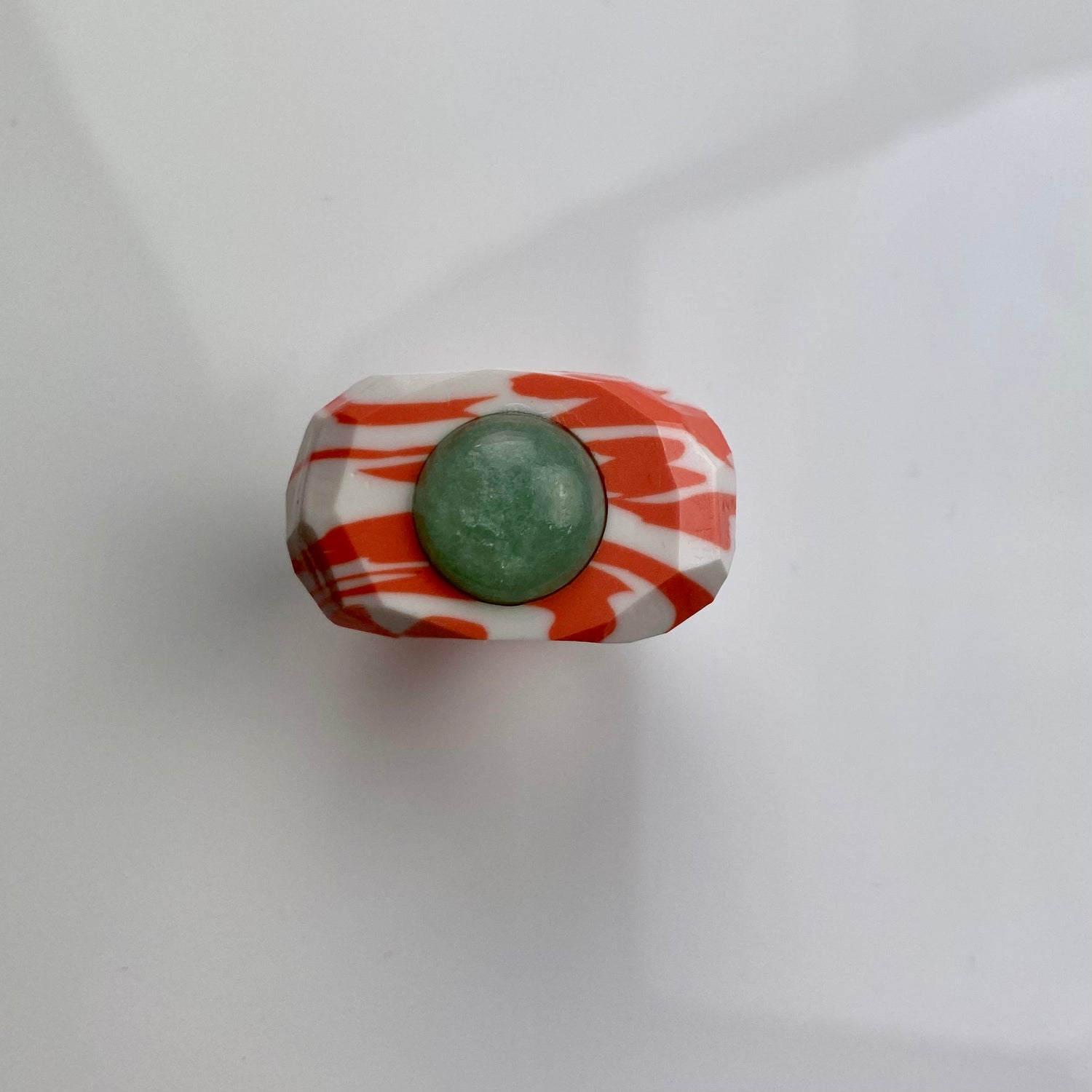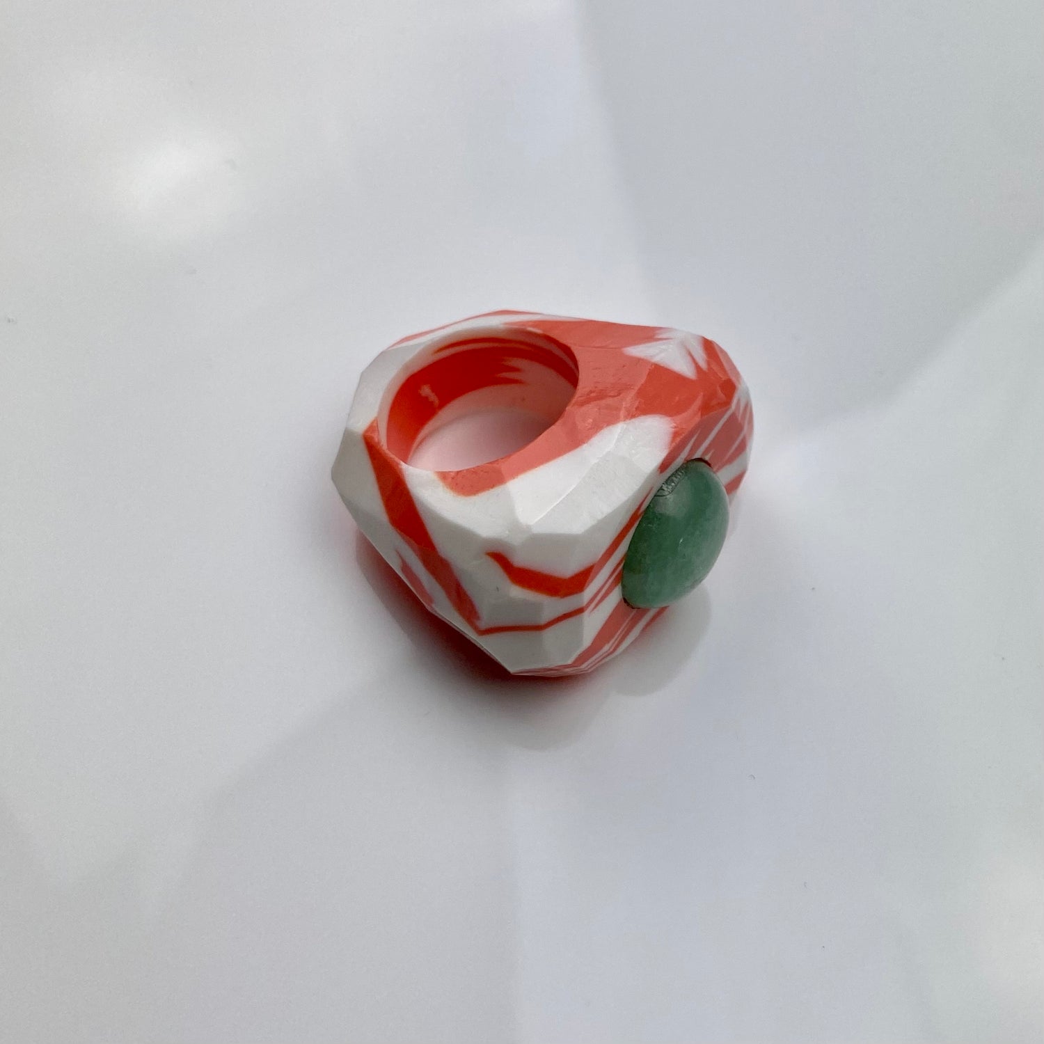 Made of lightweight clay with a glossy finish. This hand carved ring is decorated with a shiny AVENTURINE gem.
