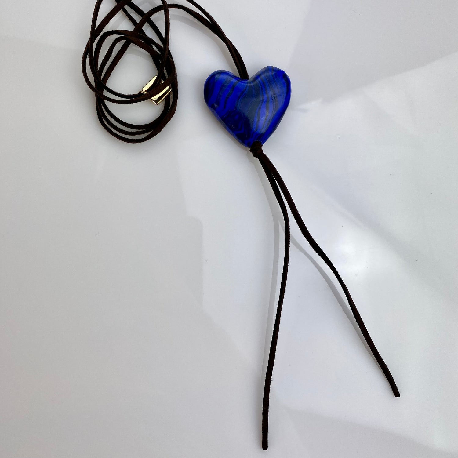 Made of lightweight clay with a glossy finish, lined up on a leather cord.
