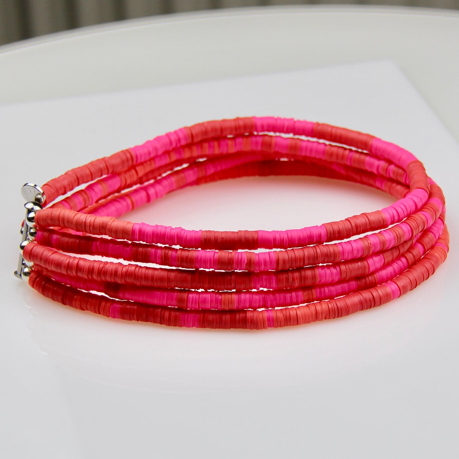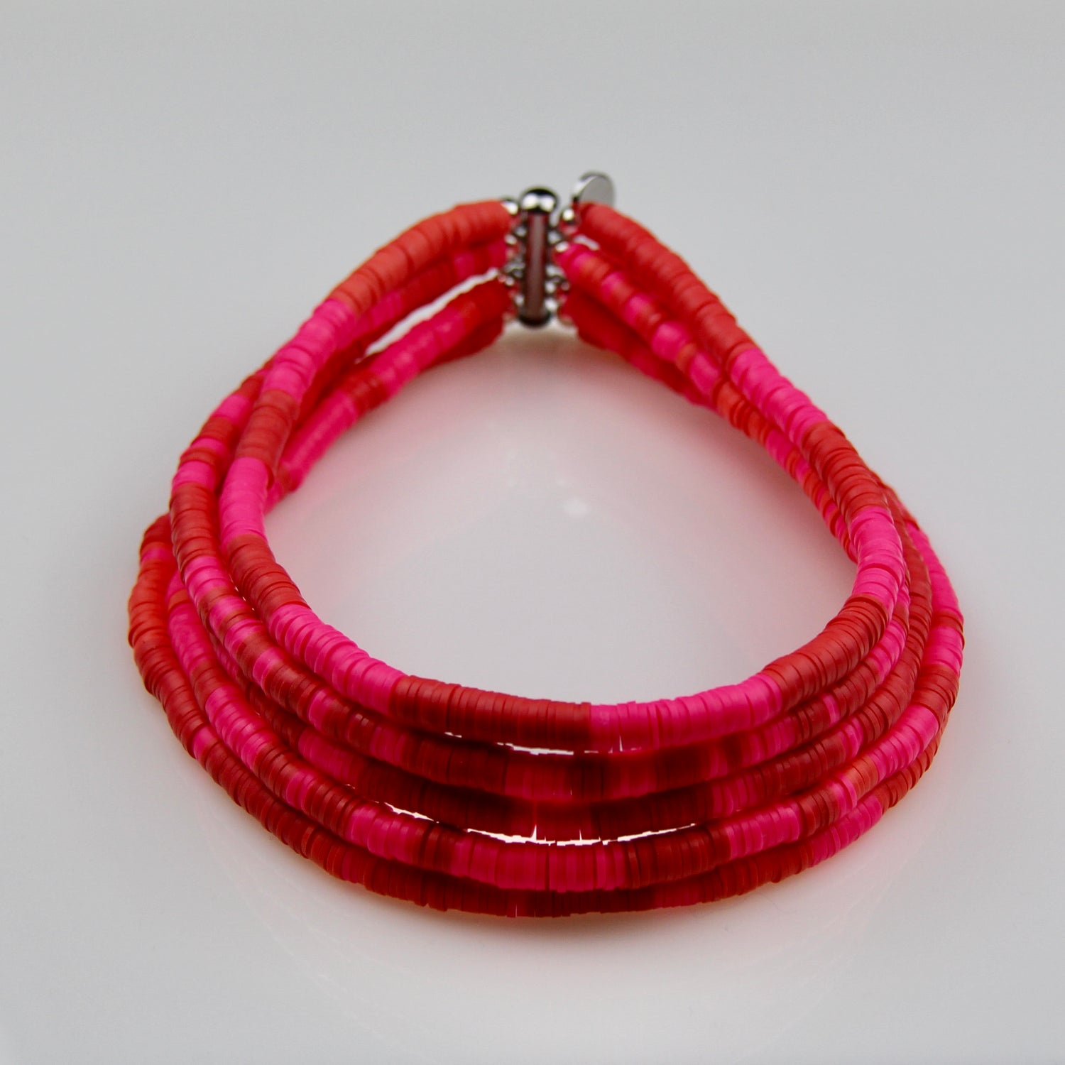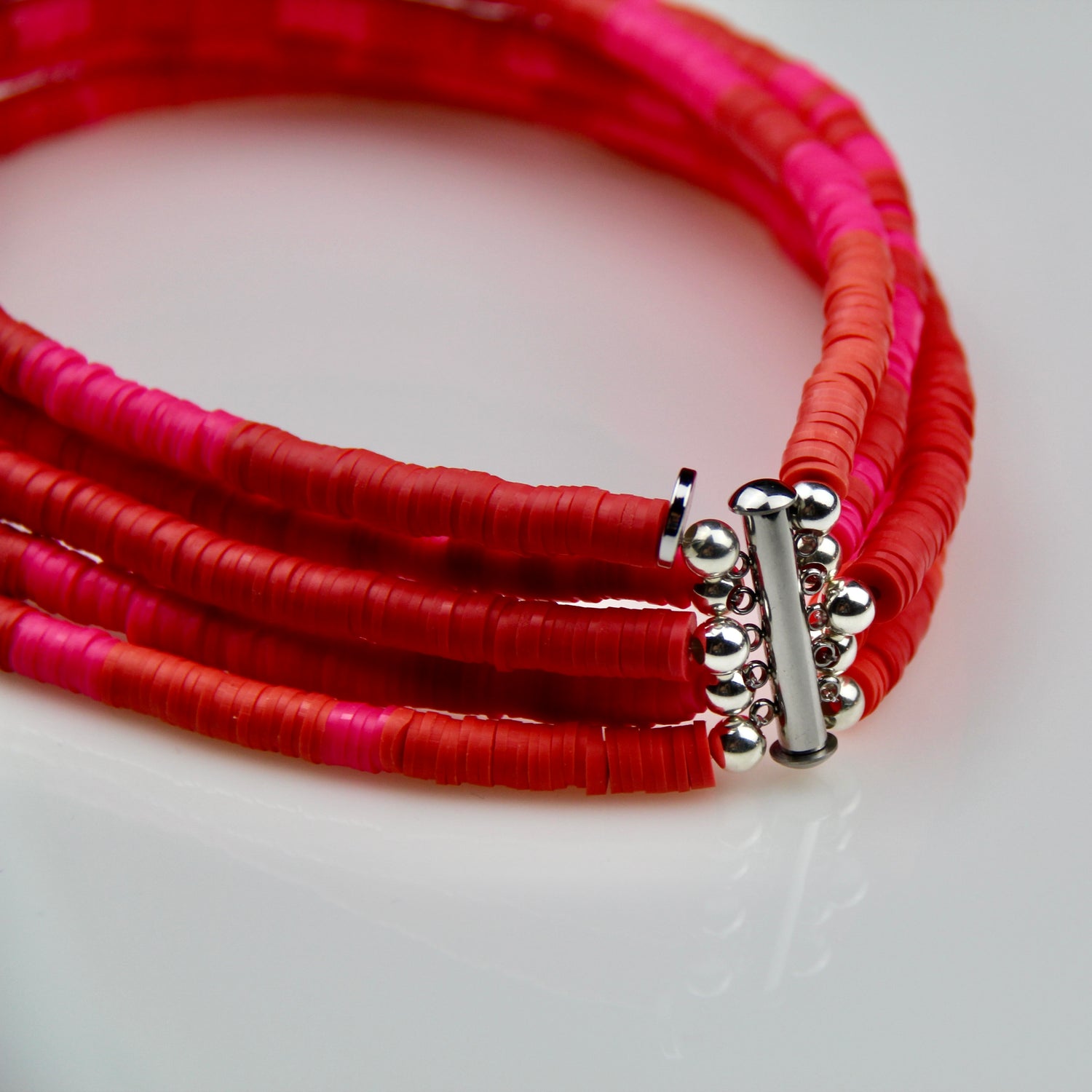 The katsuki beads lined up on a transparent string, combined with rhodium-plated brass pearls and multi-strand-clasp.