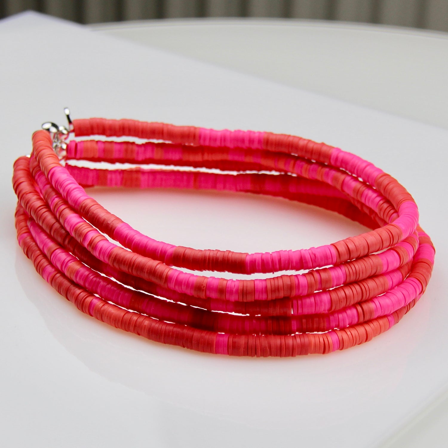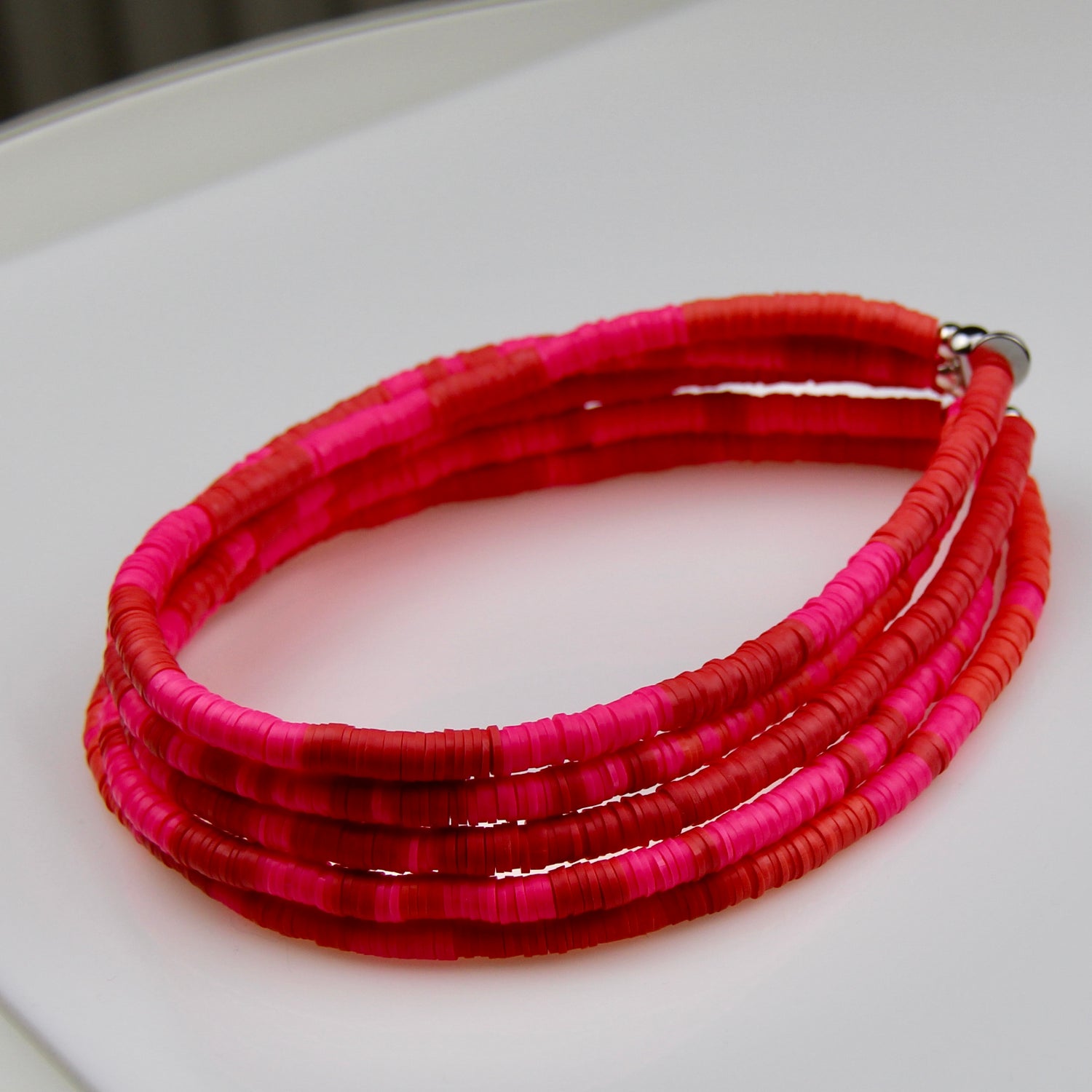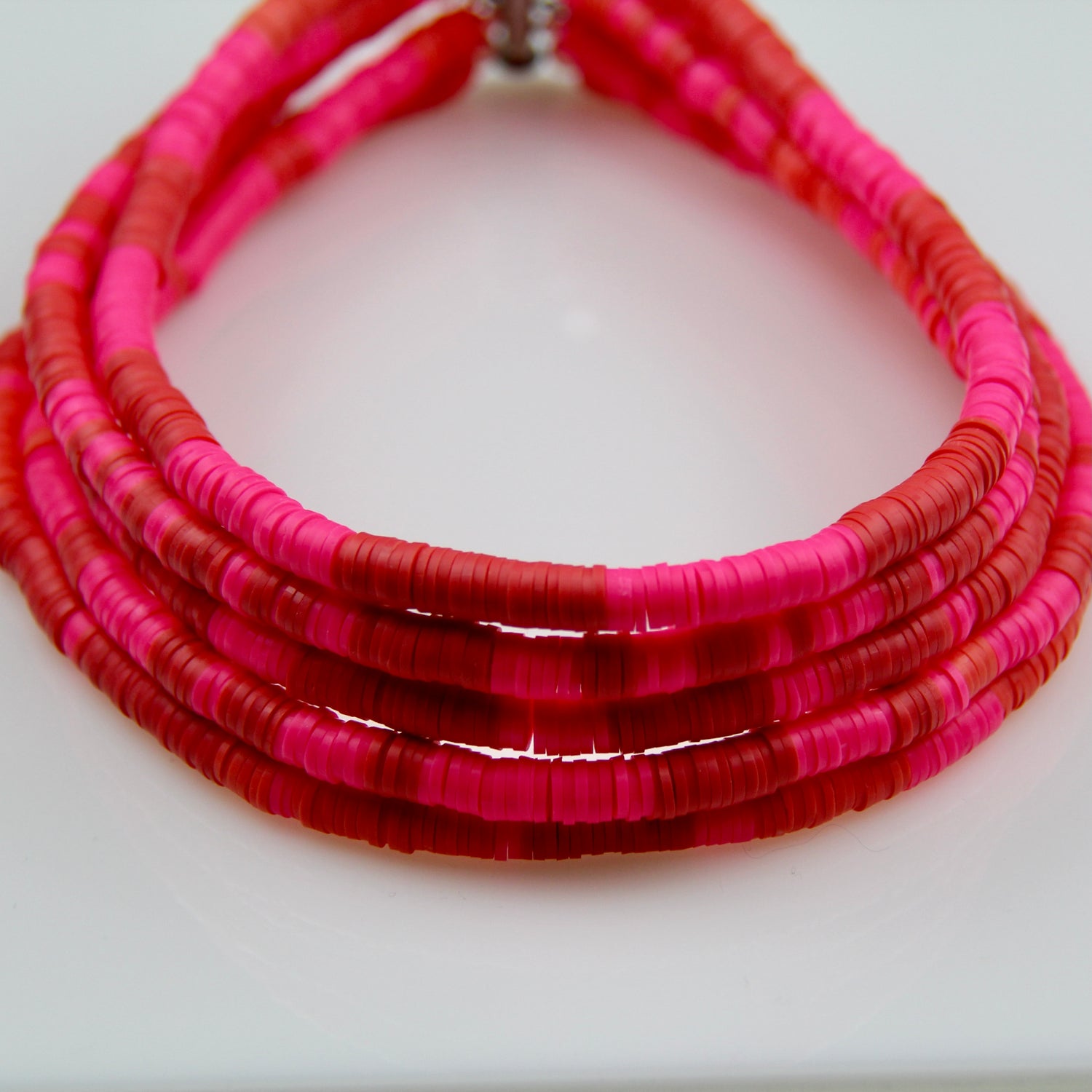 The katsuki beads lined up on a transparent string, combined with rhodium-plated brass pearls and multi-strand-clasp.