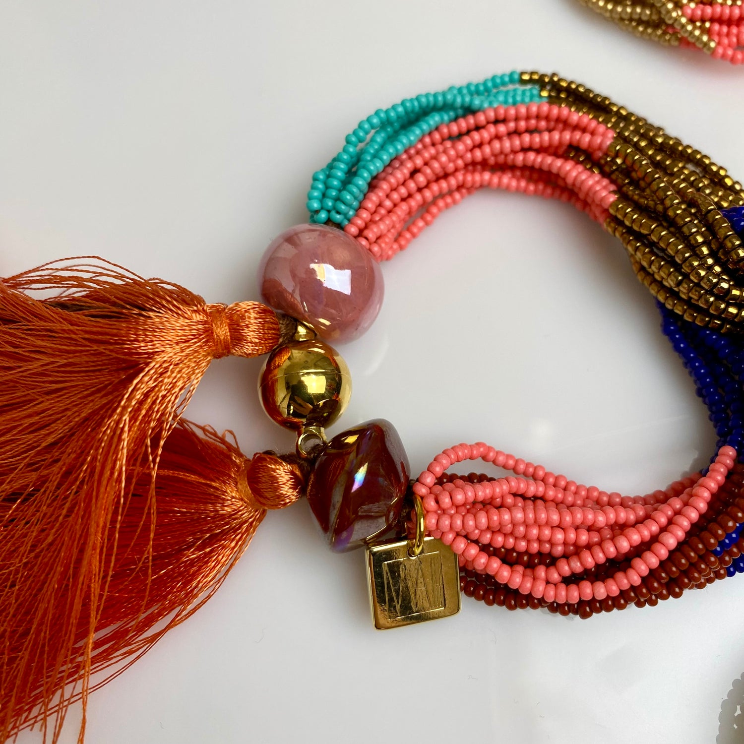 Made of rocaille glass beads and handmade ceramic beads on cotton strings combined with shimmering silk tassels and a 14k-gold-plated magnetic clasp.