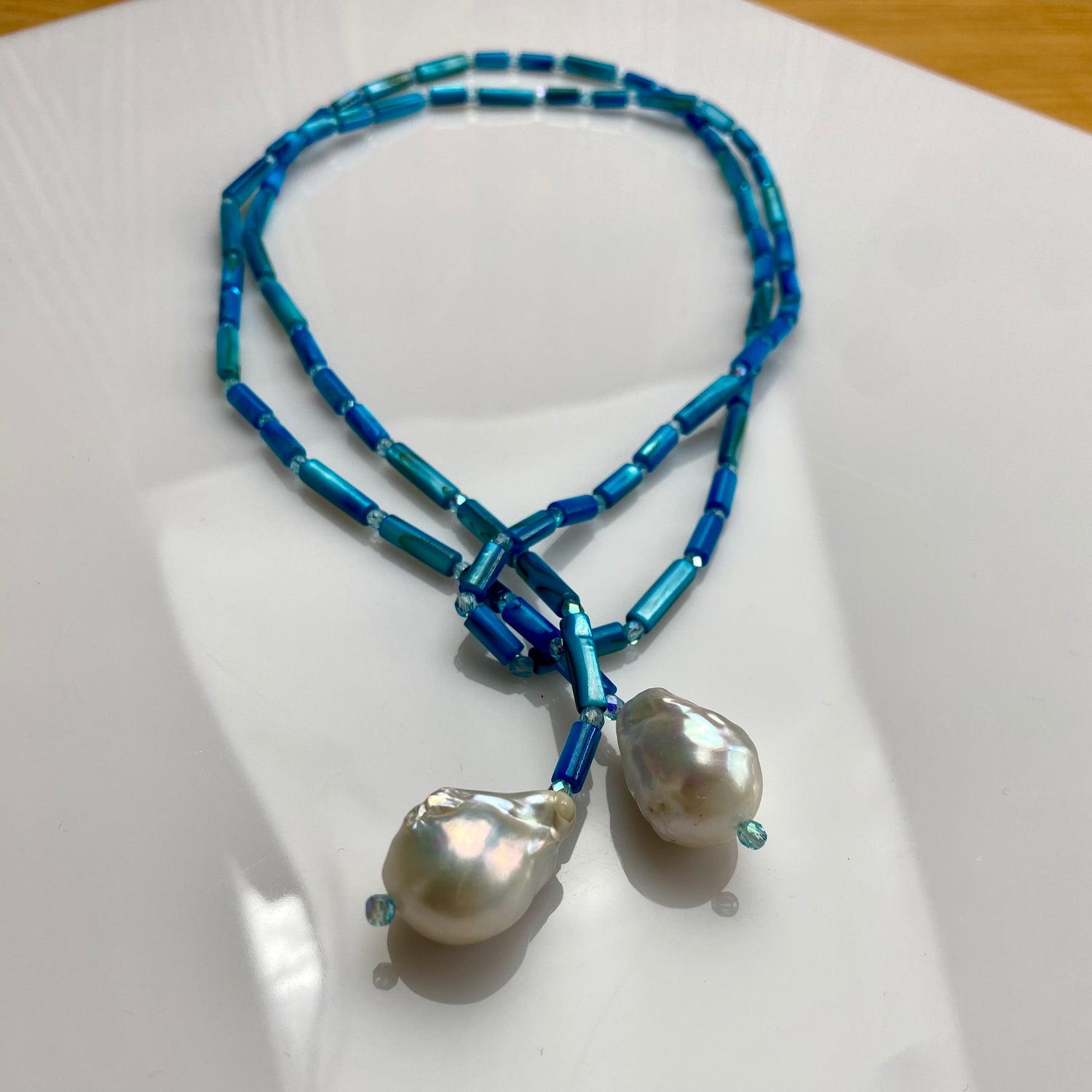 Made of facetted glass beads and shell beads on a cotton string combined with big baroque sweetwater pearls.