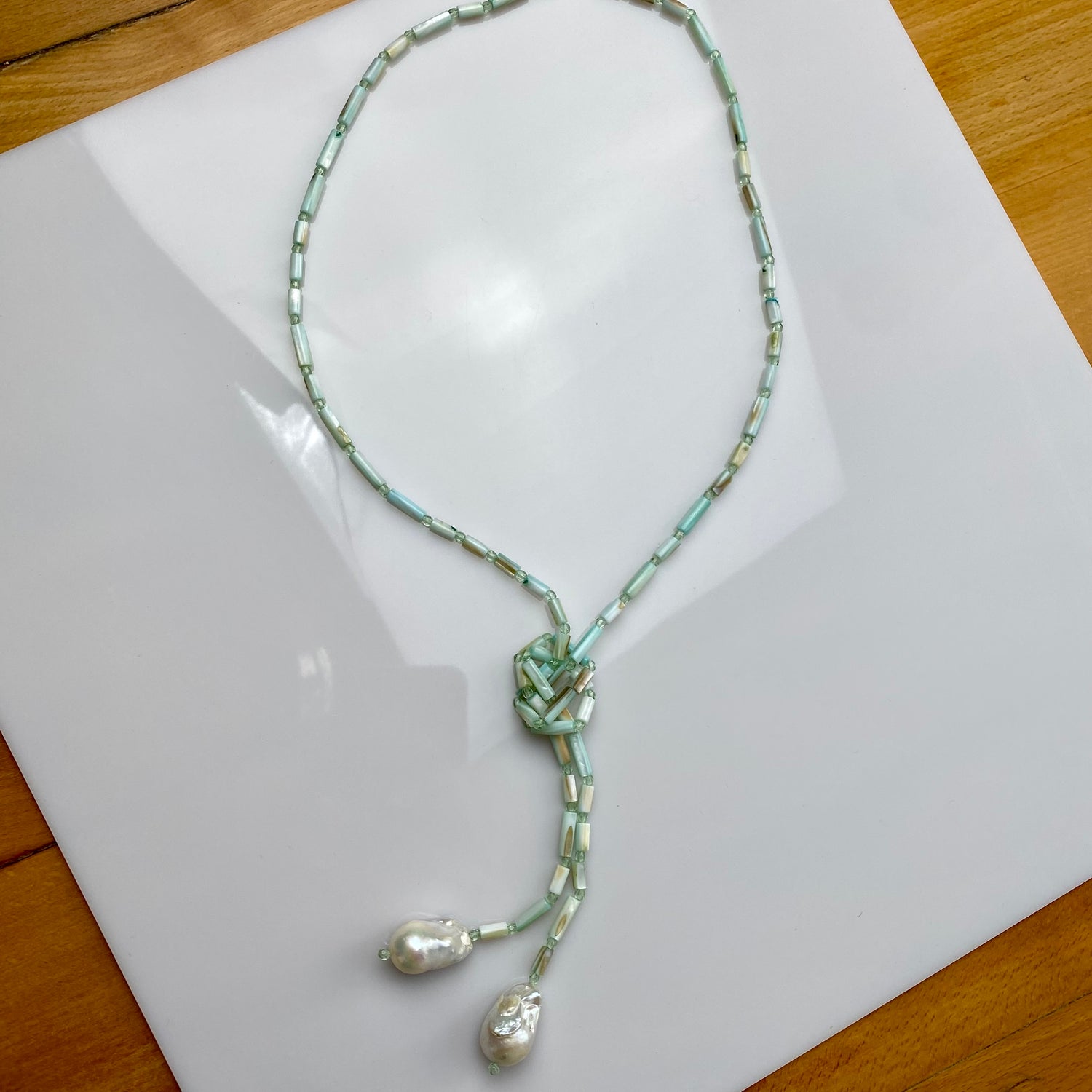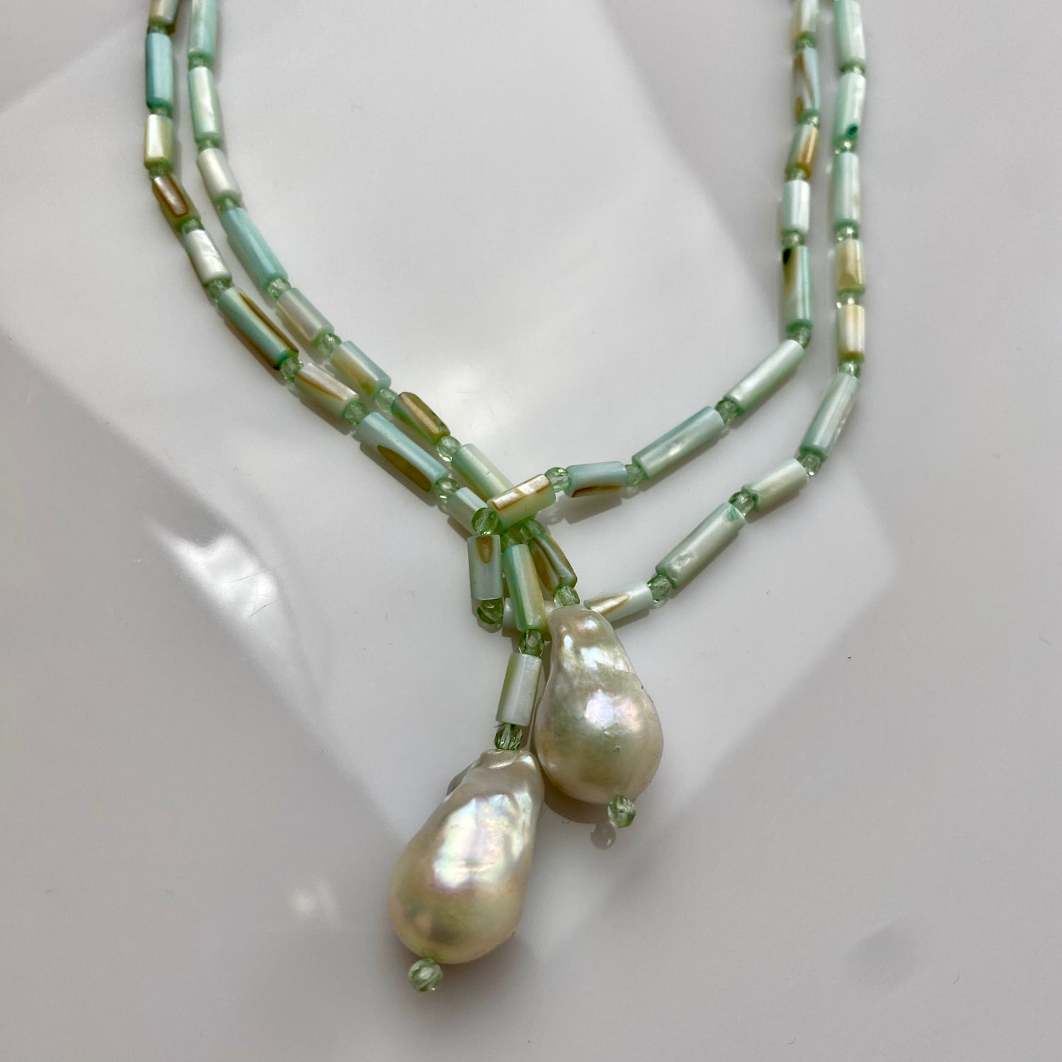 Made of facetted glass beads and shell beads on a cotton string combined with big baroque sweetwater pearls.