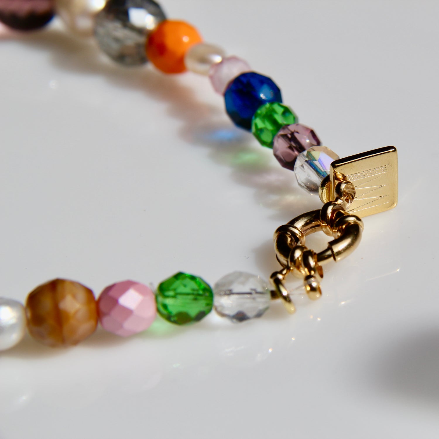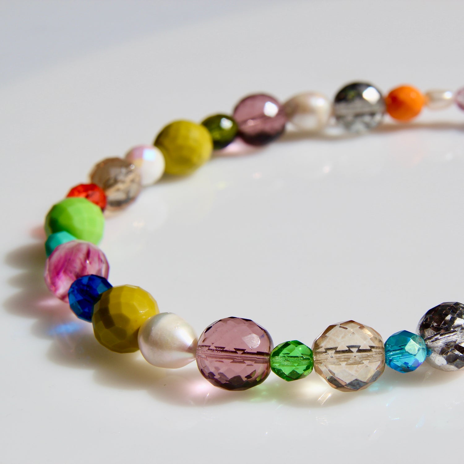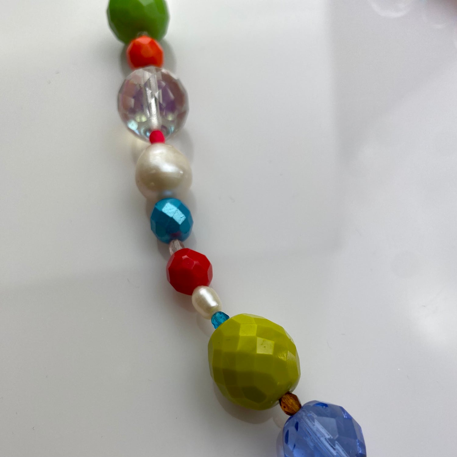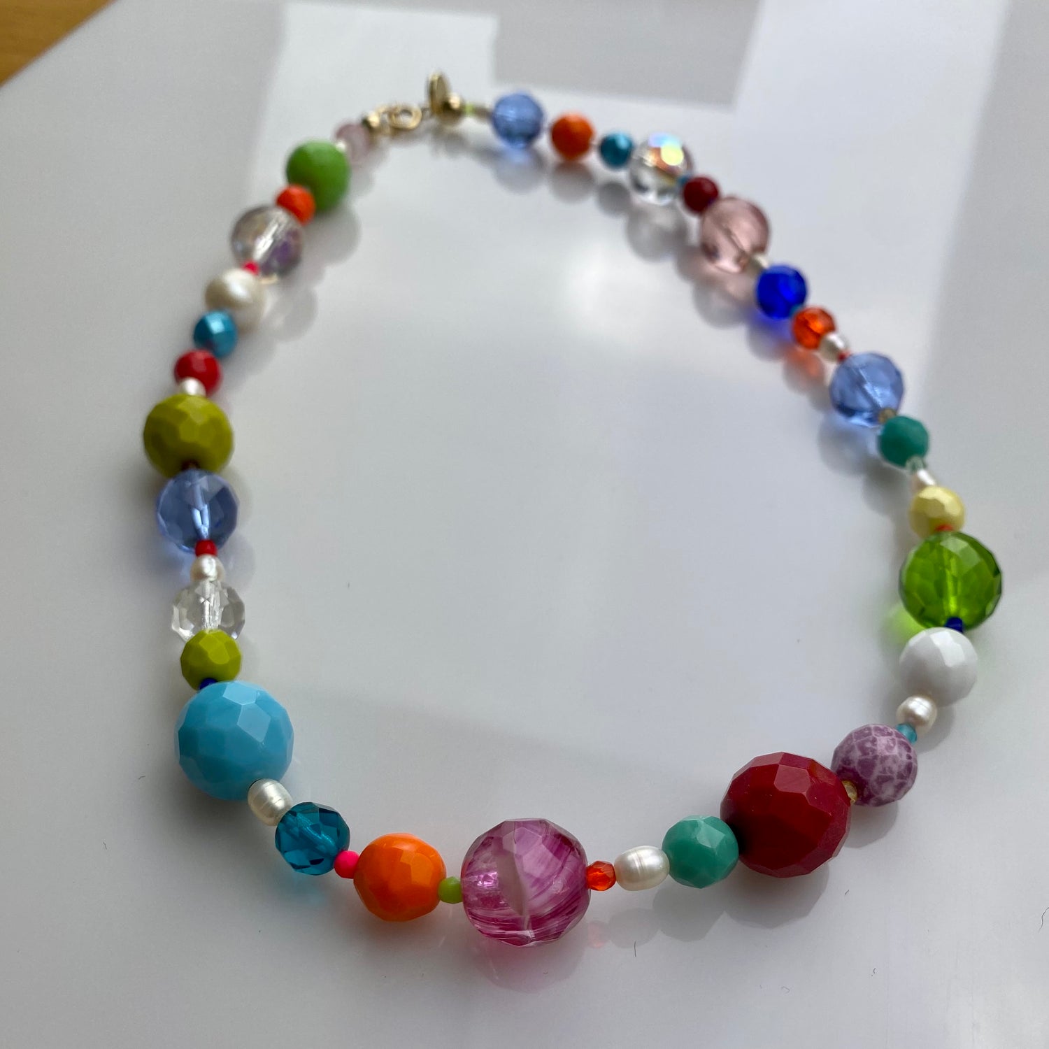 Glass pearls in light transparent and intense opaque colors are threaded on a transparent string combined with rhodium-plated or 14k gold-plated brass .